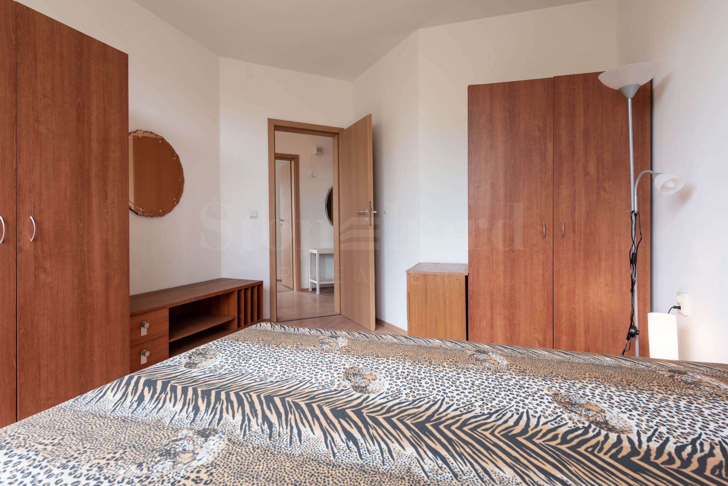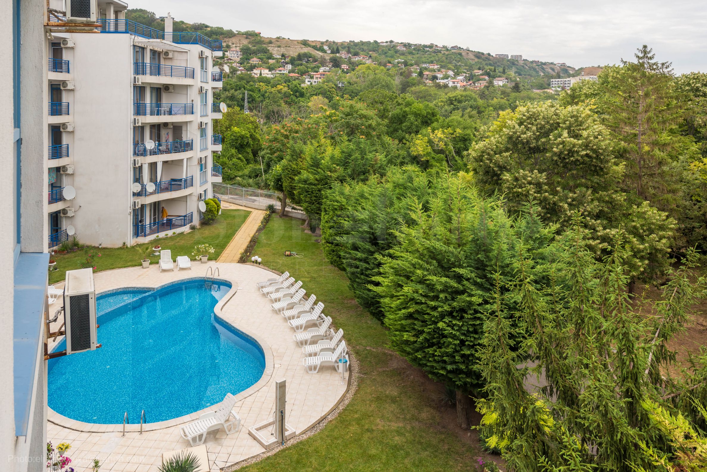Este compus dintr-o terasă panoramică, 2 dormitoare, un living cu zonă de bucătărie, 2 băi cu toalete (una aparținând dormitorului principal). Din proprietate se deschid priveliști către piscină, verdeața stațiunii și mare.