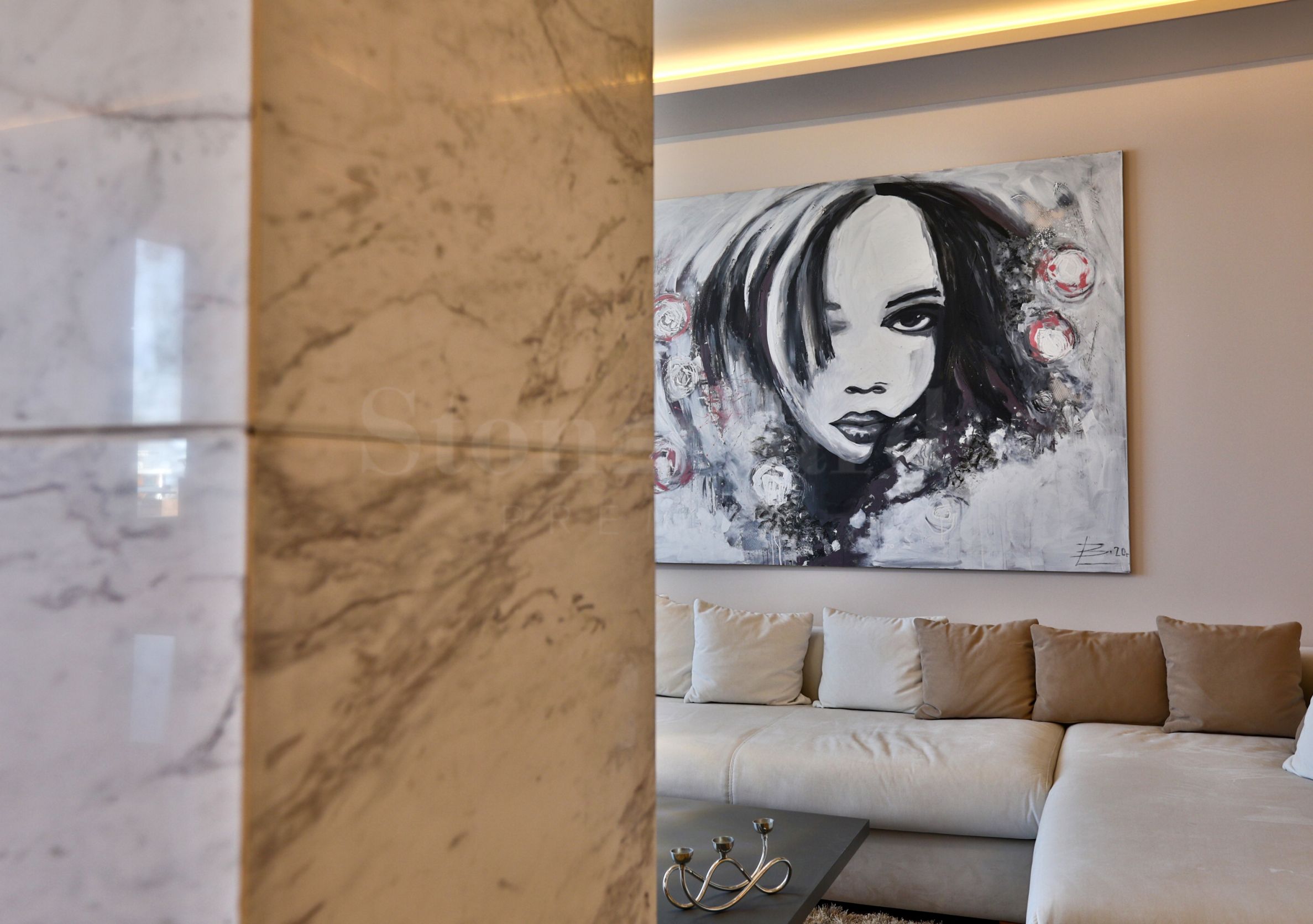 Mobilier tapițat; masă din plăci de marmură conform unui proiect individual; șase scaune; masă de cafea din furnir natural; șemineu pe gaz; bucătărie încorporată; două LED-uri „Samsung”; mașină de spălat cu uscător „Beko”; frigider „Eurolux”; cuptor cu microunde încorporat „Eurolux”; cuptor cu plite „Eurolux”; mașină de spălat vase „Eurolux”; aparat de aer condiționat „Gree”; hotă „Faber”; pat cu saltea; dulap cu pereți despărțitori din sticlă; tablouri; corpuri de iluminat.