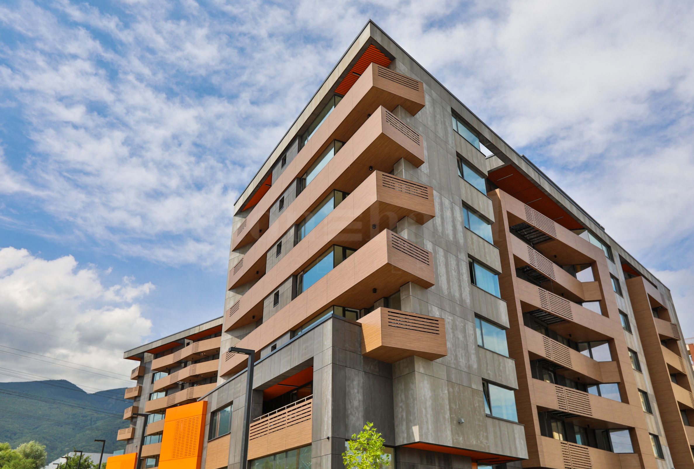 Fațade - finisate complet conform proiectului cu ceramică de fațadă - plăci de granit și panouri compozite - Etalbond portocaliu, HPL - panouri FUNDERMAX culoarea nuc;