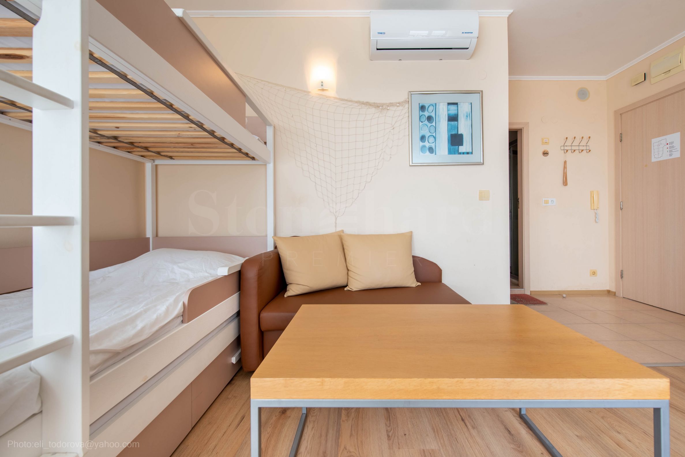 Proprietatea este complet mobilată și echipată, recent fiind efectuate reparații și schimbarea aparatelor de aer condiționat. Este compusă din living cu colț de bucătărie, dormitor, baie cu toaletă, hol și terasă. Bucătăria este comodă pentru utilizare și bine echipată: mașină de spălat vase, frigider, plită, cuptor, hotă și frigider. Dormitorul are orientare sudică și dispune de pat de dormit, dulap și televizor. Baia este echipată cu cabină de duș.