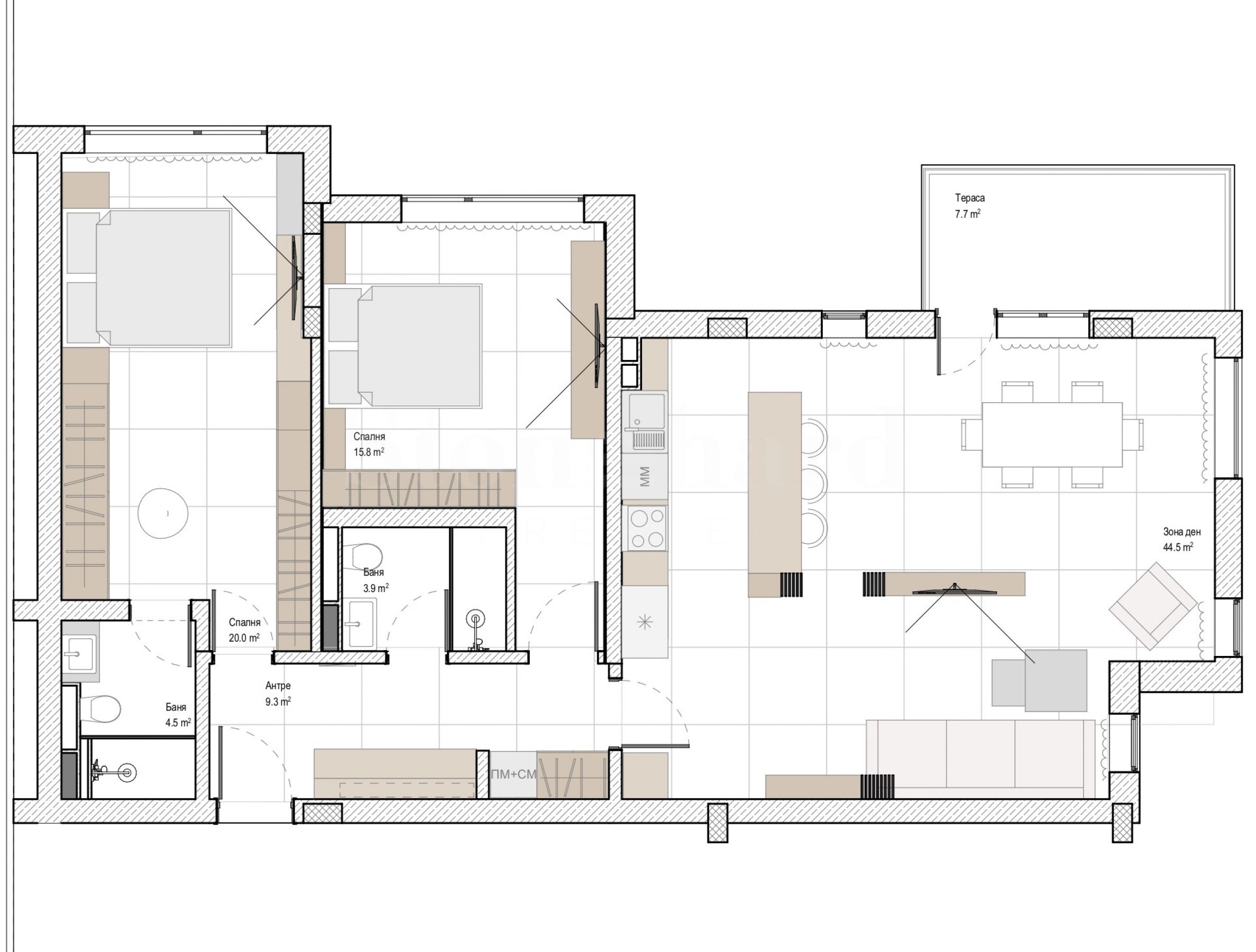просторная гостиная с террасой, с которой открывается вид на гору Витоша и прекрасно оформленные зеленые зоны комплекса. В стоимость недвижимости включен дизайн-проект интерьера от известного дизайнерского дома. Установлена современная система водяного подогрева пола за дополнительную плату в размере 9000 левов, а также будет установлен тепловой насос NIBE — чрезвычайно высокого класса, гарантирующий максимальный комфорт и очень низкую себестоимость. Тепловой насос обойдется дополнительно в 25 000 левов.