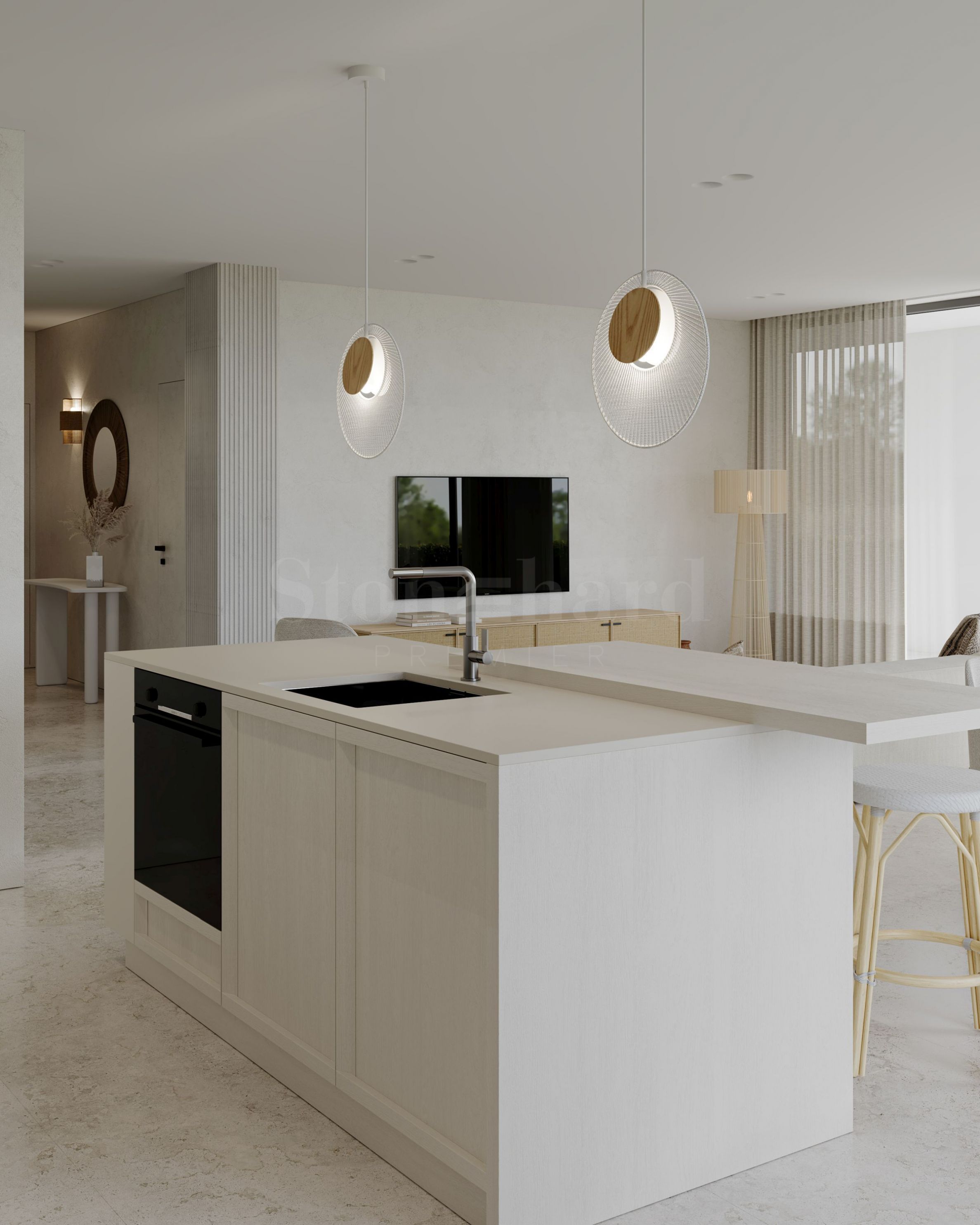 На третьей линии от пляжа будут расположены 4 трехэтажных здания с террасами, в которых разместятся просторные трех- и четырехкомнатные апартаменты, всего в 100 метрах по прямой от моря. Апартаменты предлагаются с оштукатуренными стенами и стяжкой, с возможностью меблировки.