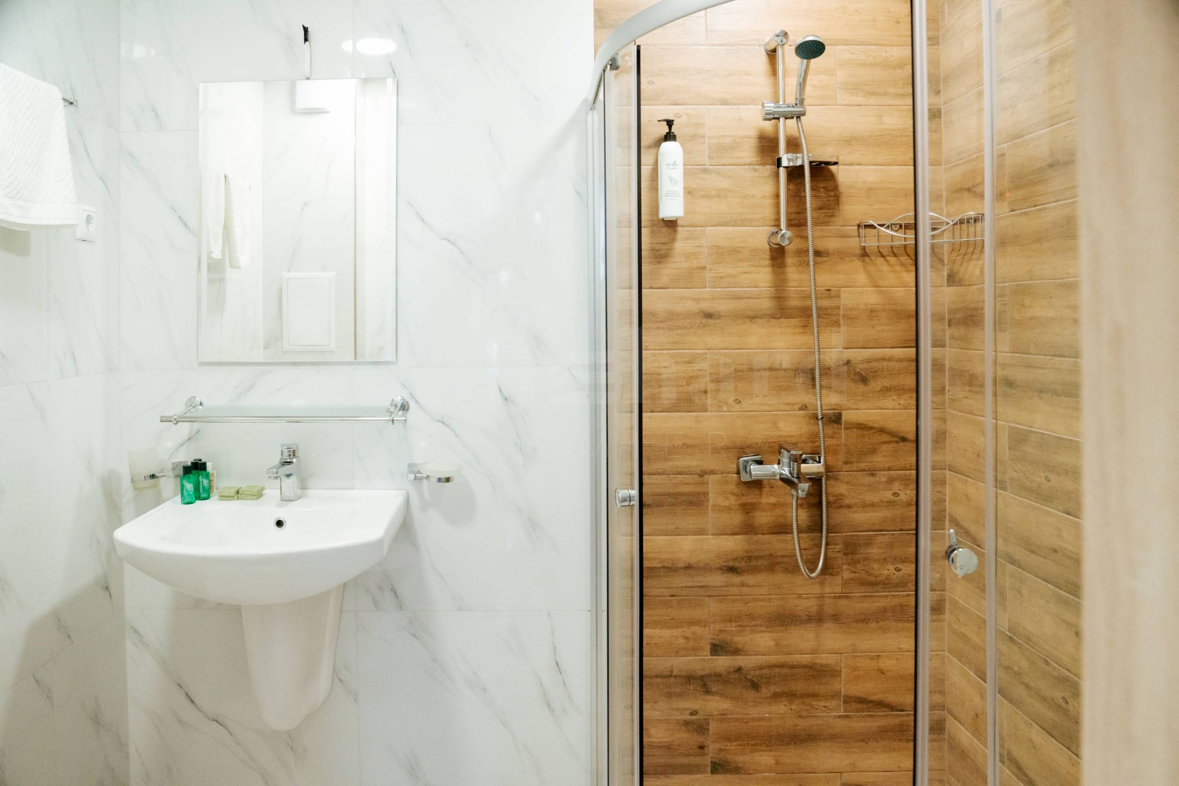 полы – плитка и ламинат, двери – МДФ.