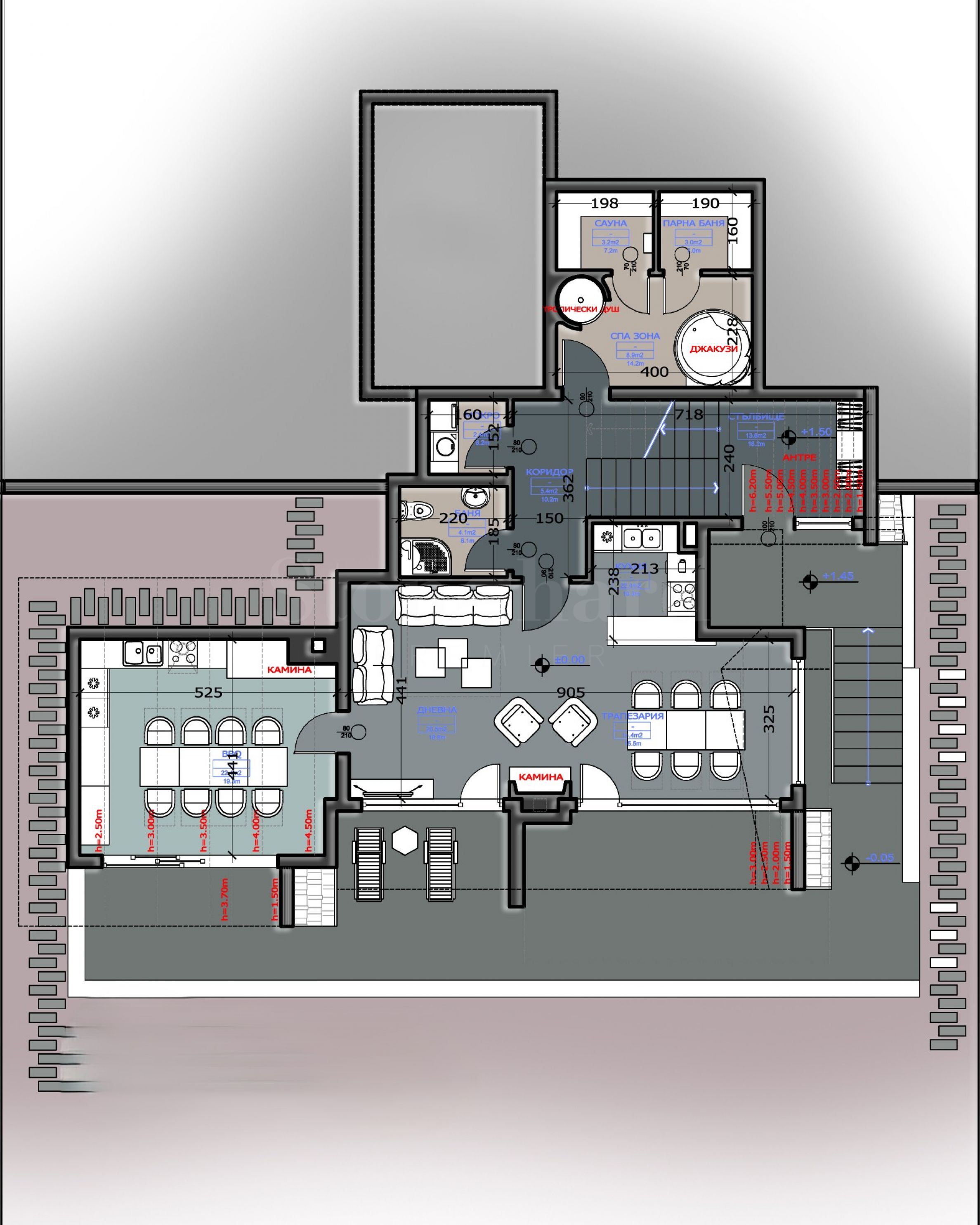 фасад отделан минеральной штукатуркой BAUMIT, с декоративными элементами из натурального камня и специально обработанного натурального дерева;