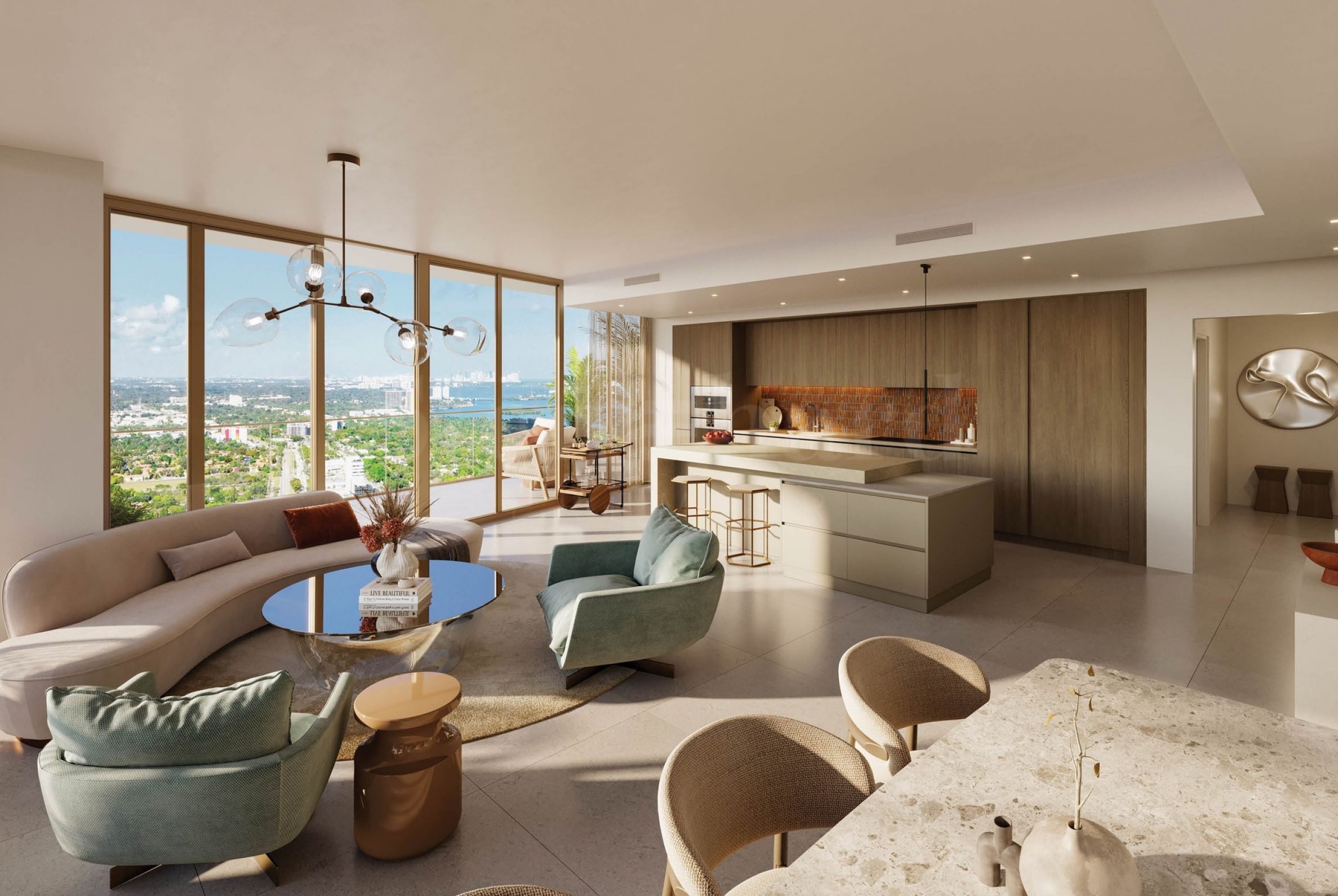 Большинство апартаментов ориентированы так, чтобы из окон открывался потрясающий 180-градусный вид на залив Бискейн, район дизайна Майами и центр города — впечатления, которые превращают каждое утро и вечер в настоящее зрелище.