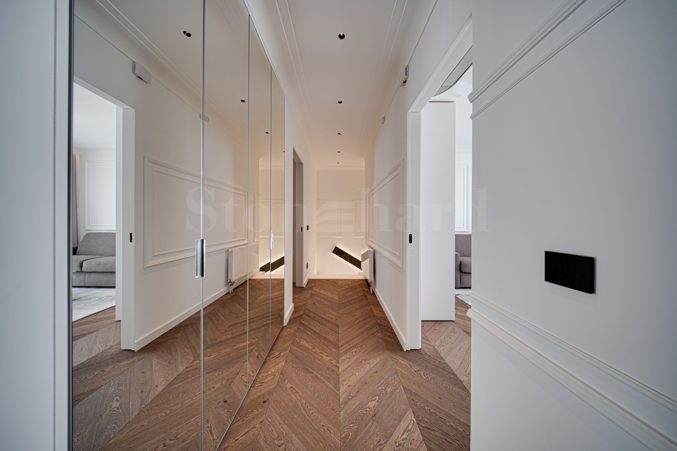 Подвал — гараж на четыре машины (и два открытых парковочных места), подсобные помещения и складские помещения. Все отделочные материалы и оснащение высшего класса: