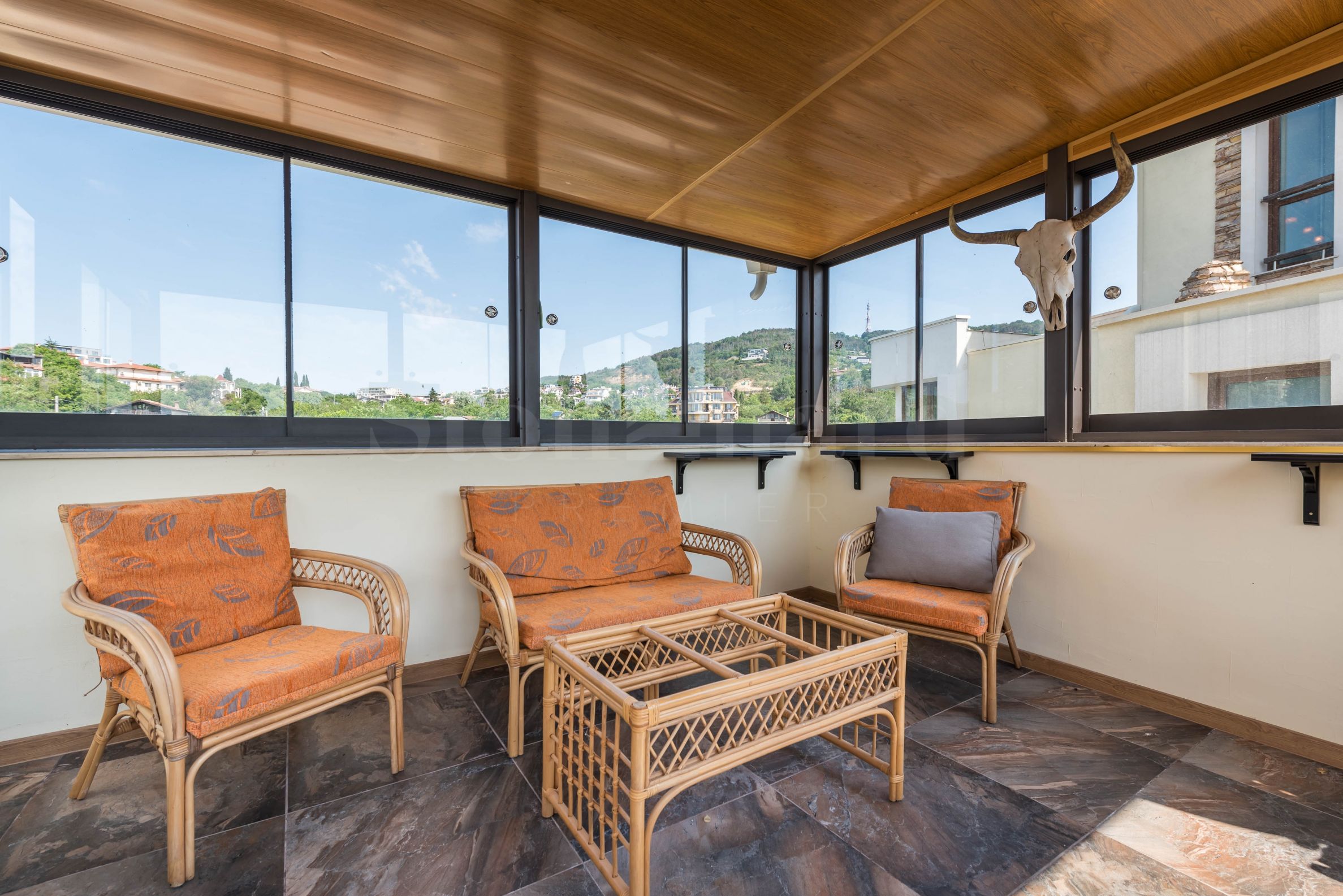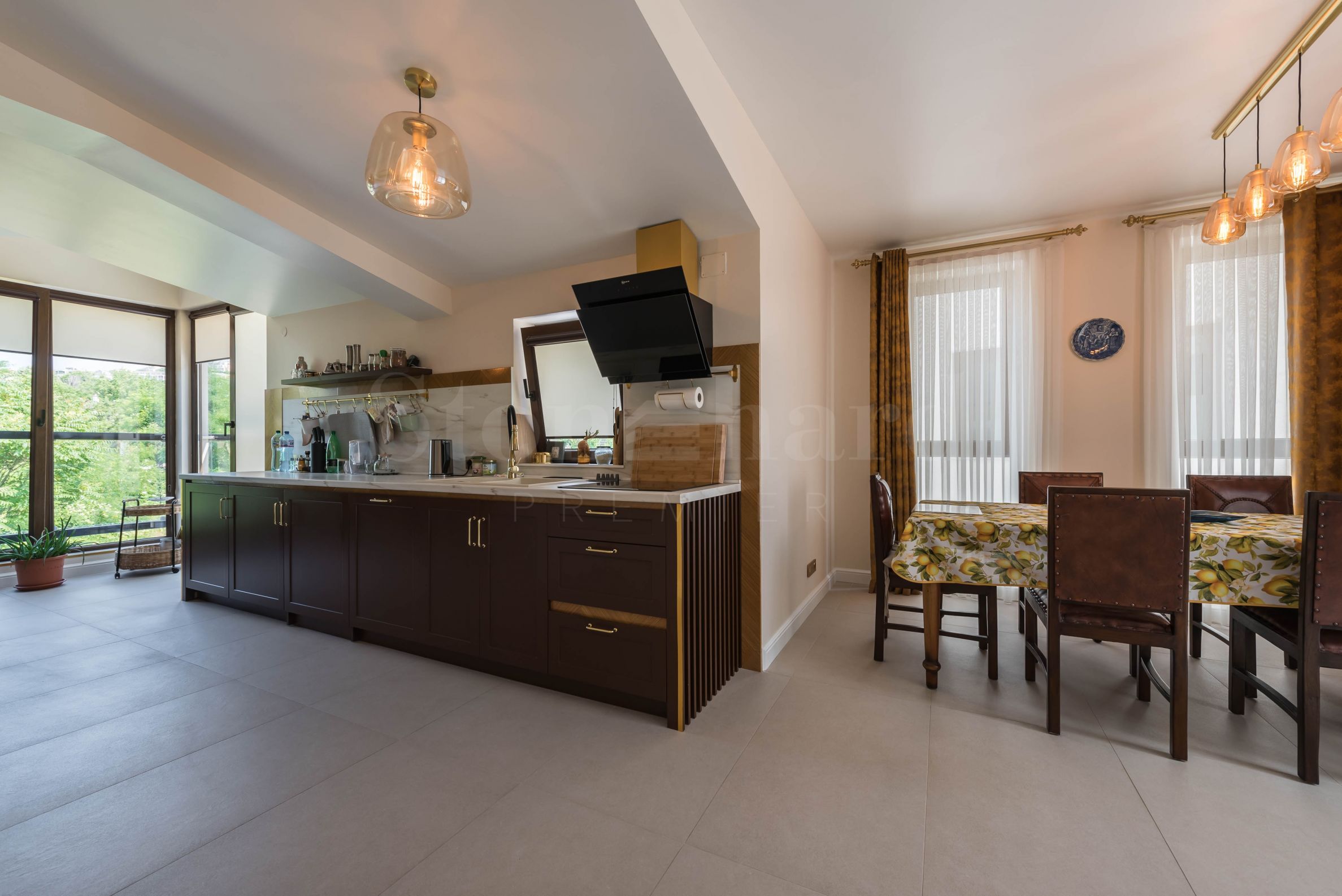Пентхаус выполнен в дизайнерском стиле и обставлен качественными материалами и функциональной мебелью. Кухонные шкафы изготовлены из массива дерева, а электроприборы – от известного немецкого производителя. На террасе с панорамным видом на море расположен профессиональный барбекю с оборудованной зоной для приятных обедов и ужинов в кругу семьи и друзей. Открытая терраса на первом этаже также подходит для летнего загара.