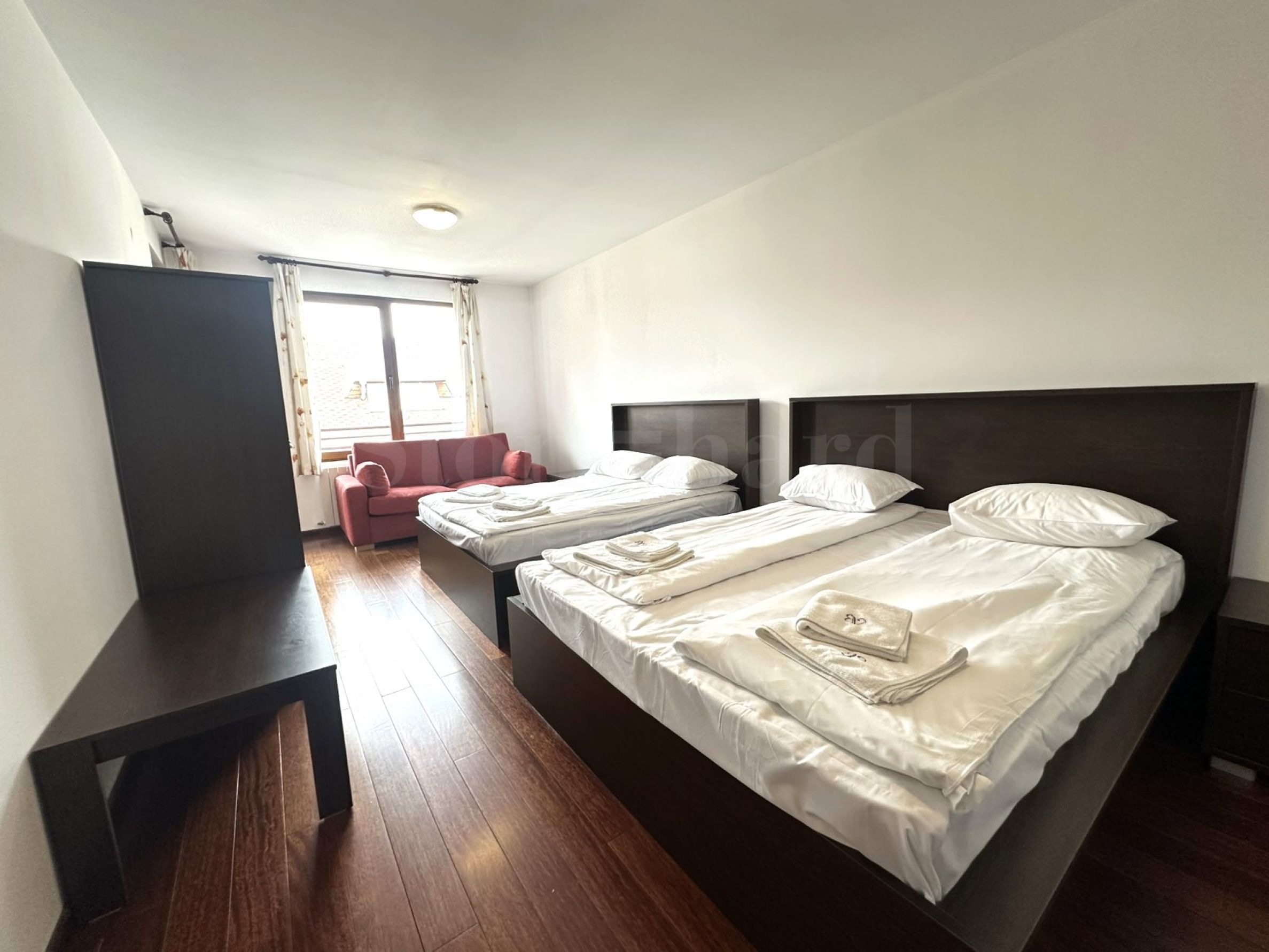 Большая спальня с двумя двуспальными кроватями, трехстворчатым шкафом, а также удобным диваном;