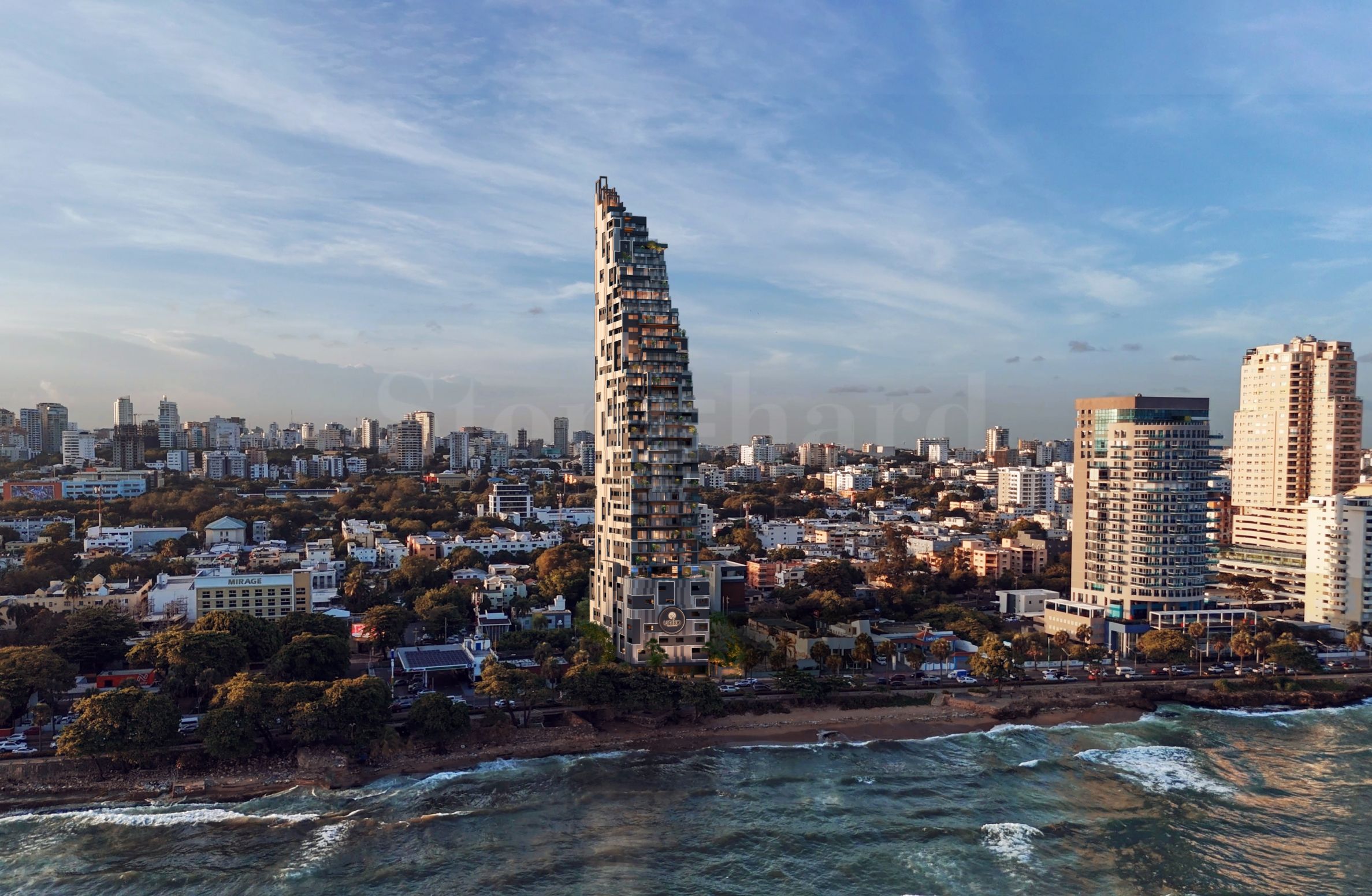 Цель проекта Uniko Residences — создание пространства на возвышенностях Санто-Доминго, где населенный пункт и море становятся неотъемлемой частью жизни его жителей. 32-этажное здание с инновационной архитектурой, имеющей наклон на верхних этажах, впечатляет своим видом с первого взгляда. Его силуэт запоминающийся, а для фасада известный архитектор Мануэль Клавель разработал сочетание современных и неподвластных времени материалов. Внешние стены отделаны монолитным покрытием, которое помогает сохранить цвет с течением времени и одновременно служит изоляционным и гидроизоляционным слоем, защищая внутренние помещения от влаги и протечек. Светодиодное освещение, а также чистые настенные покрытия и алюминиевые профили играют ключевую роль в общем дизайне, делая этот проект уникальным в Санто-Доминго.