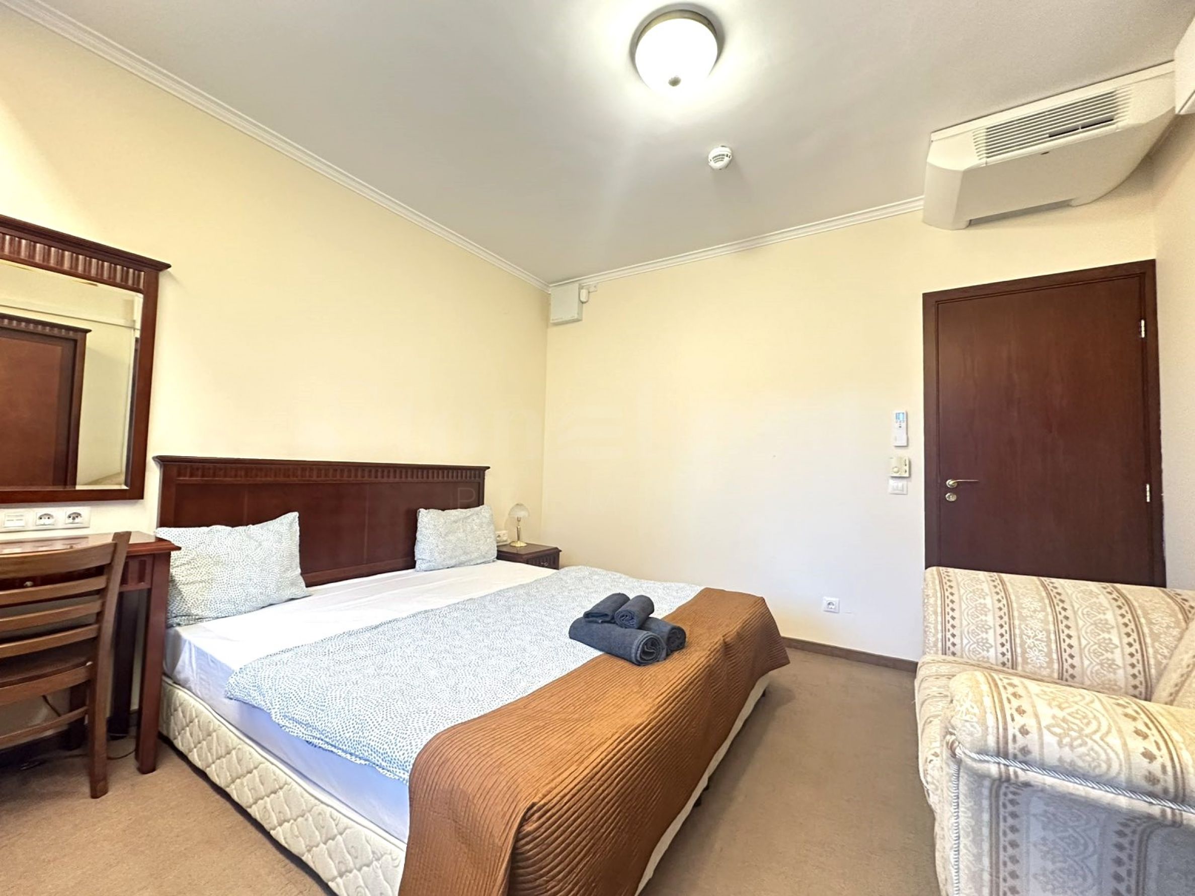 • Просторная спальня с прикроватными тумбочками, шкафом и балконом;