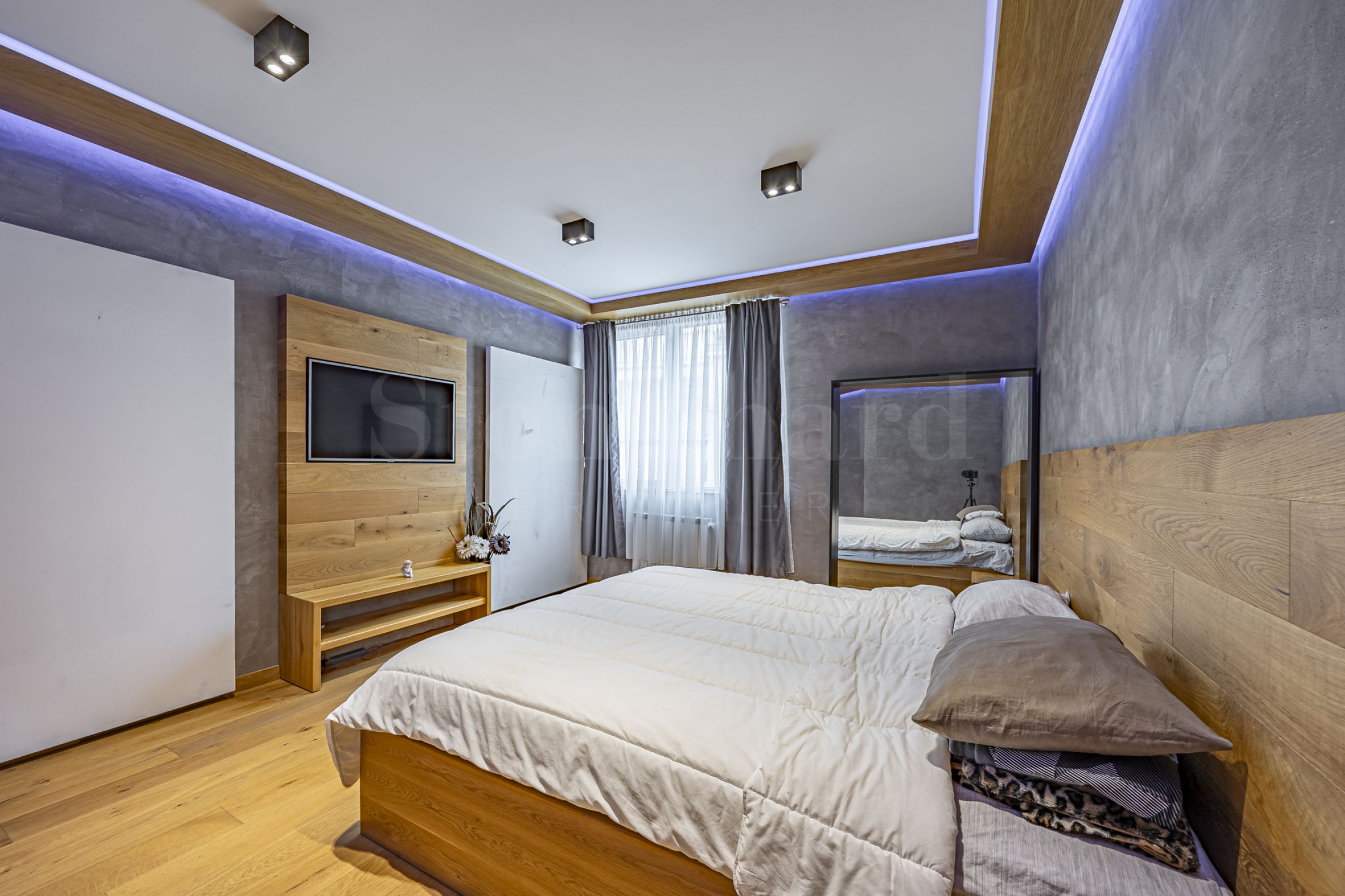 Квартира отделана и обставлена с вниманием к деталям, в натуральных тонах и материалах, создавая ощущение уюта и спокойствия. В гостиной и спальне паркет из натурального дуба, а меблировку в спальне, включая кровать, изготовлена из массива дуба — сочетание качества, долговечности и стиля.