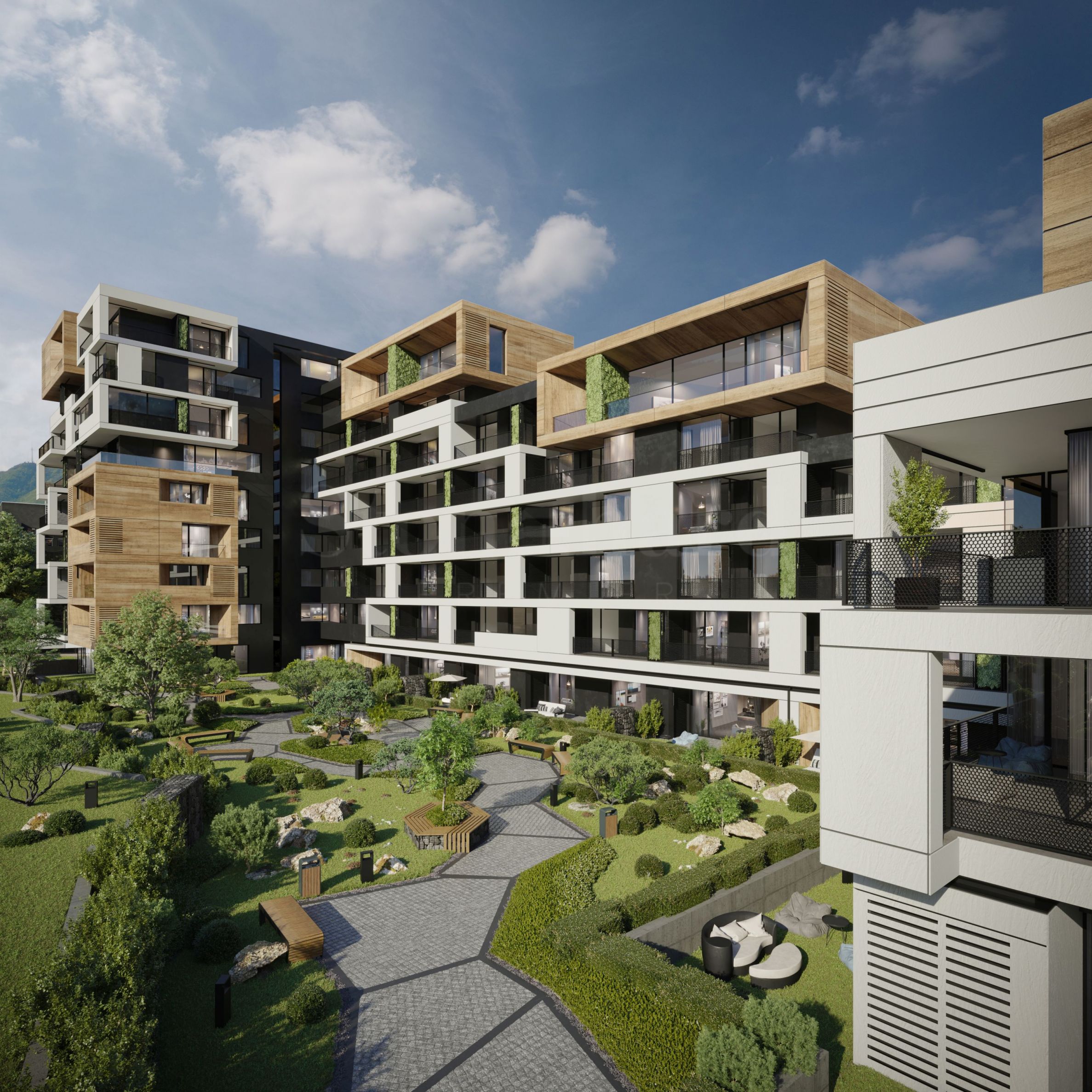 Искомая игра пластики выступающих и опускающихся объемов из стекла в общем фасаде сочетается с мотивом вертикальных зеленых стен, эстетично скрывающих кондиционеры. Все террасы, в том числе и на последнем этаже, решено сделать накрытыми с учетом солнечного освещения. Настил террас представляет собой двойной пол из гранитной плитки. Ажурные перила выполнены в двух вариантах - стеклянный триплекс или с металлическим каркасом с просечно-вытяжной сеткой, expanded metal, черного цвета в соответствии с архитектурной деталью, следуя композиционному замыслу. Дополнительная композиция фасадного линейного светодиодного освещения целенаправленно подчеркивает основную идею и в темное время суток. Идея динамичной композиции продолжена в проекте озеленения основного двора комплекса в сочетании с габионами, парковой мебелью и освещением и водными зонами.