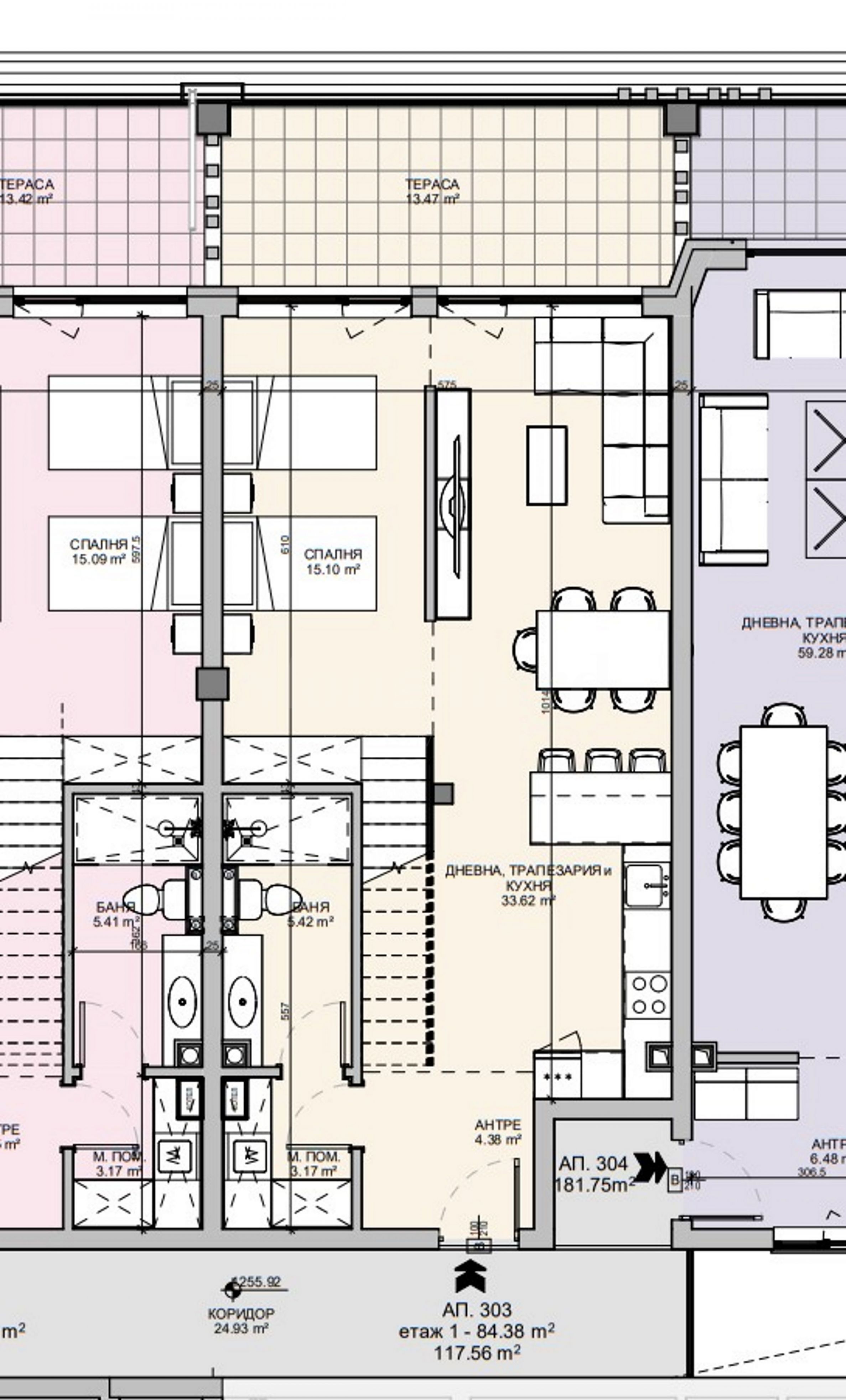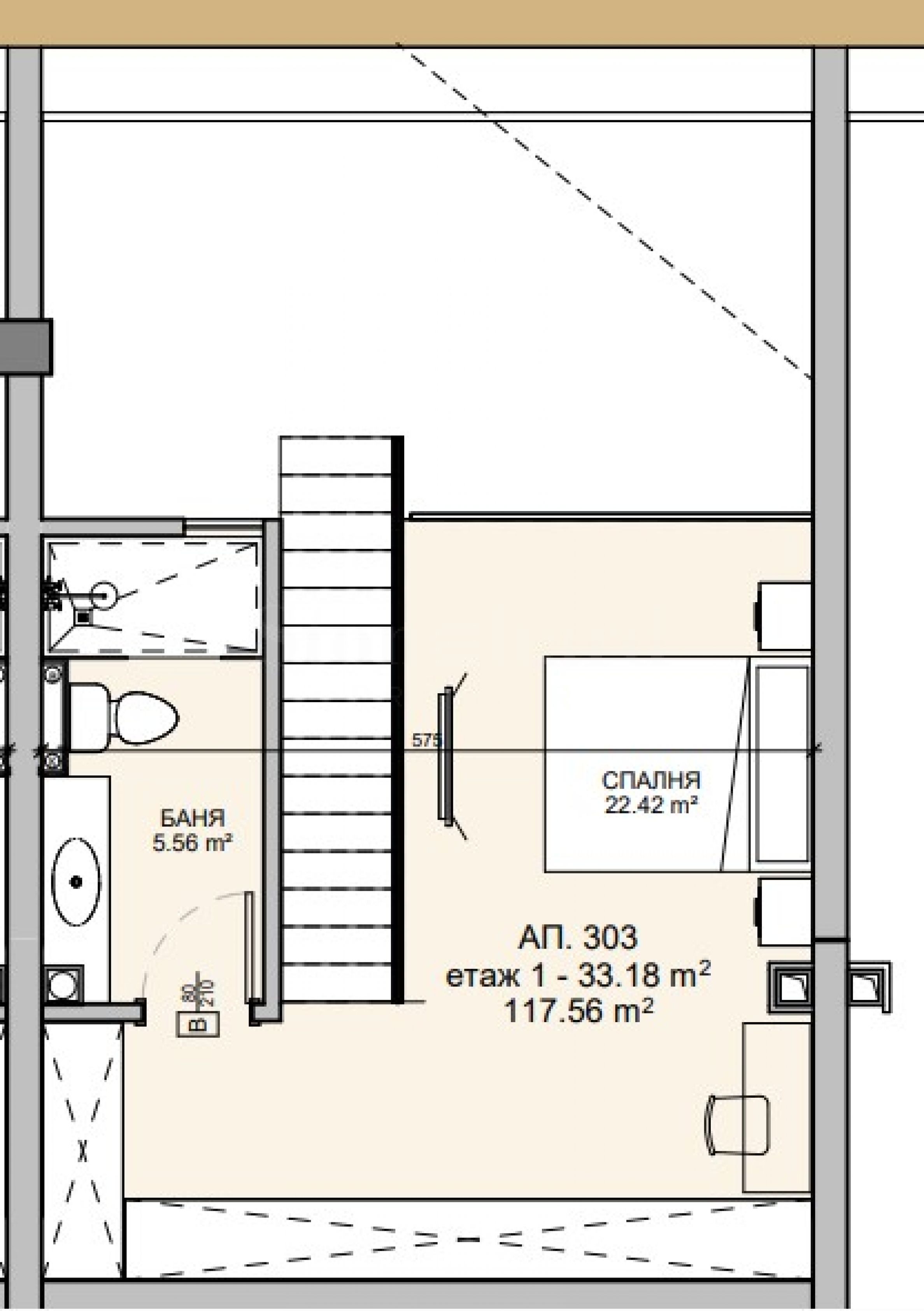 Квартира расположена на 3-м и 4-м этажах и имеет общую площадь 147,19 кв. м (чистая площадь 119,53 кв. м + общая площадь 27,66 кв. м). На первом этаже находятся прихожая, гостиная с кухонным уголком, спальня, ванная комната с туалетом и терраса, а на втором этаже — спальня и ванная комната с туалетом.