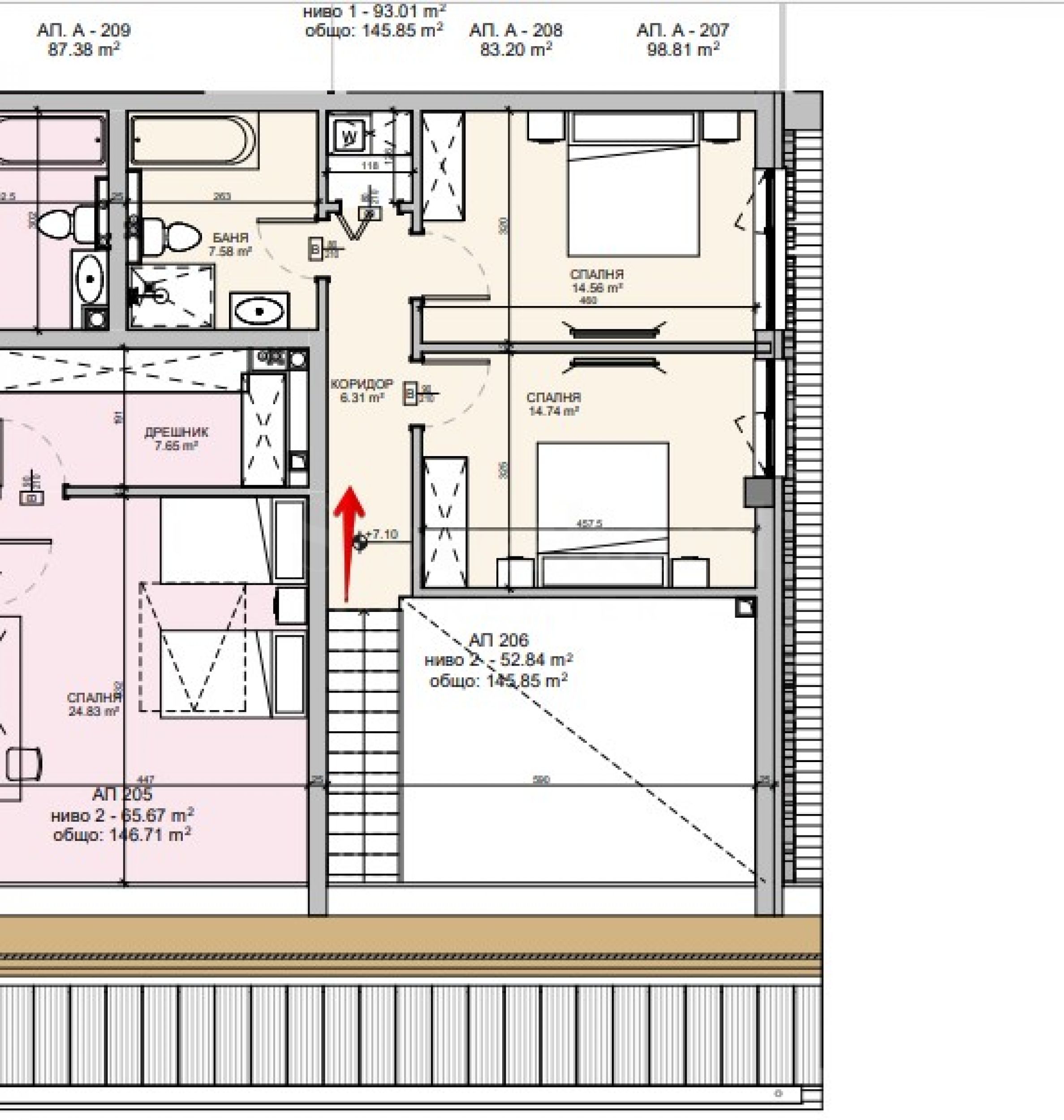 Квартира расположена на 2-м и 3-м этажах и имеет общую площадь 178,35 кв. м (чистая площадь 145,59 кв. м + общая площадь 32,76 кв. м). На первом этаже находятся прихожая, гостиная с мини-кухней, две спальни, ванная комната с туалетом и отдельный туалет, а на втором этаже — спальня и ванная комната с туалетом.