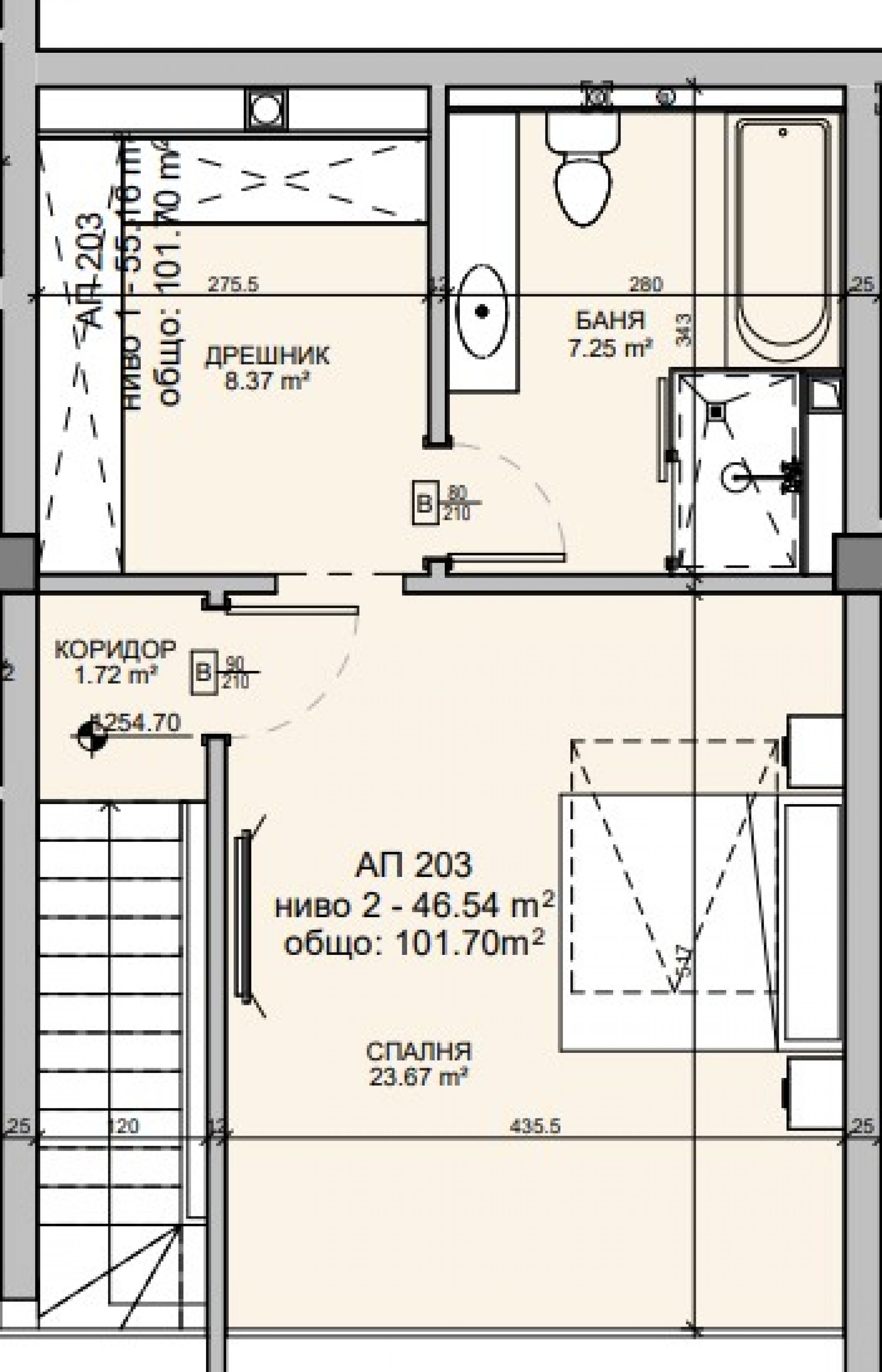 Квартира расположена на 2-м и 3-м этажах и имеет общую площадь 124,01 кв. м (чистая площадь 101,92 кв. м + общая площадь 22,09 кв. м). На первом этаже находятся прихожая, гостиная с кухней, гостевой туалет, подсобное помещение и терраса, а на втором этаже — спальня, гардеробная и ванная комната с туалетом.