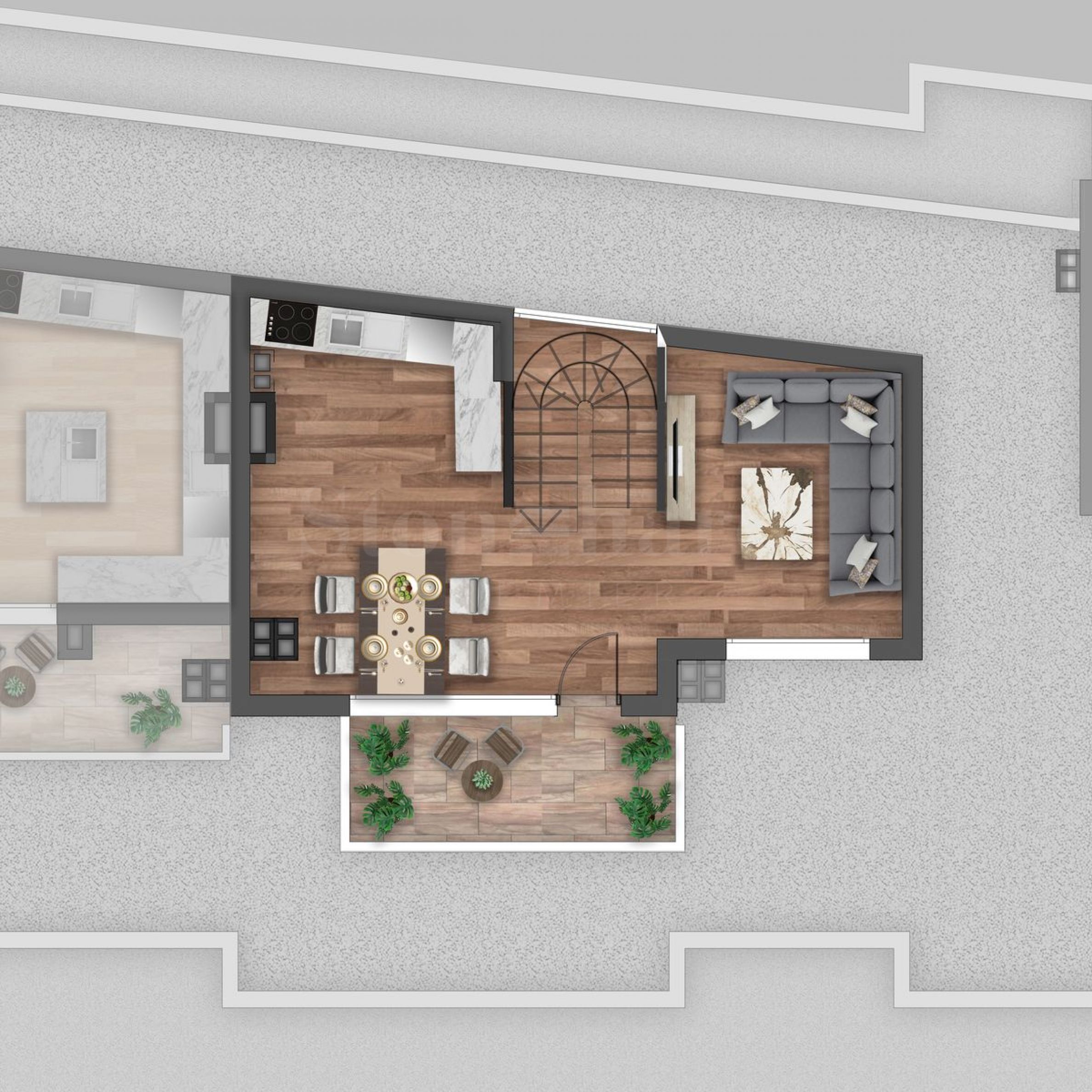 Трехкомнатный мезонет с панорамной террасой на крыше с обзором на 360 градусов.