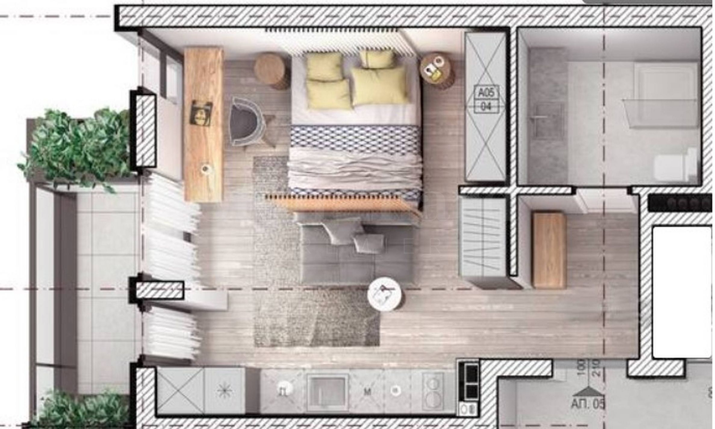 Квартира общей площадью 56,21 кв. м расположена на 2 этаже и состоит из прихожей, гостиной с кухней, ванной комнаты с туалетом и террасы. Сдается в степени завершенности согласно болгарским стандартам, со шпатлевкой и стяжкой, с установленной бронированной входной дверью.