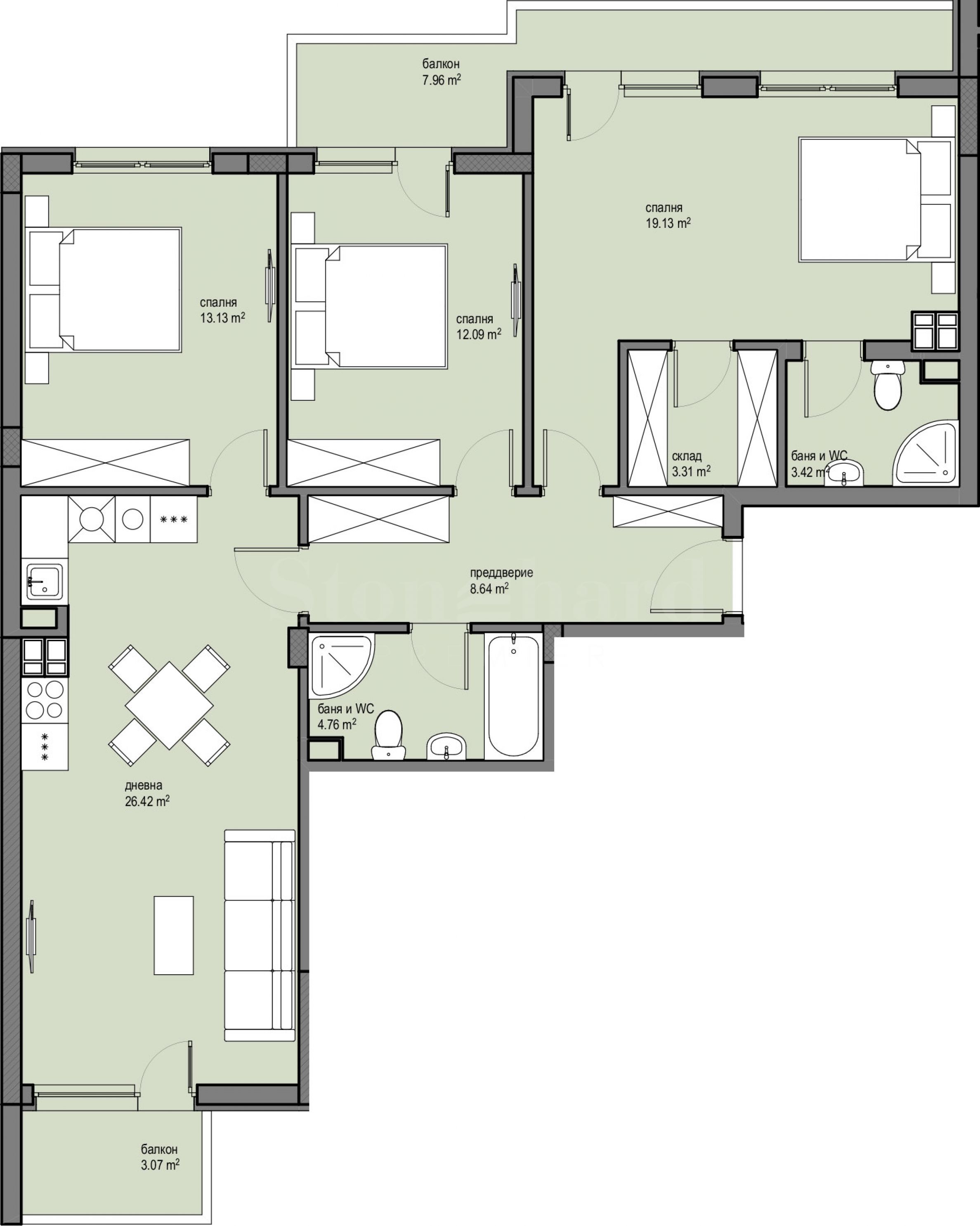 гостиная с кухней и столовой, со второй террасой. Уровень завершения BDS: