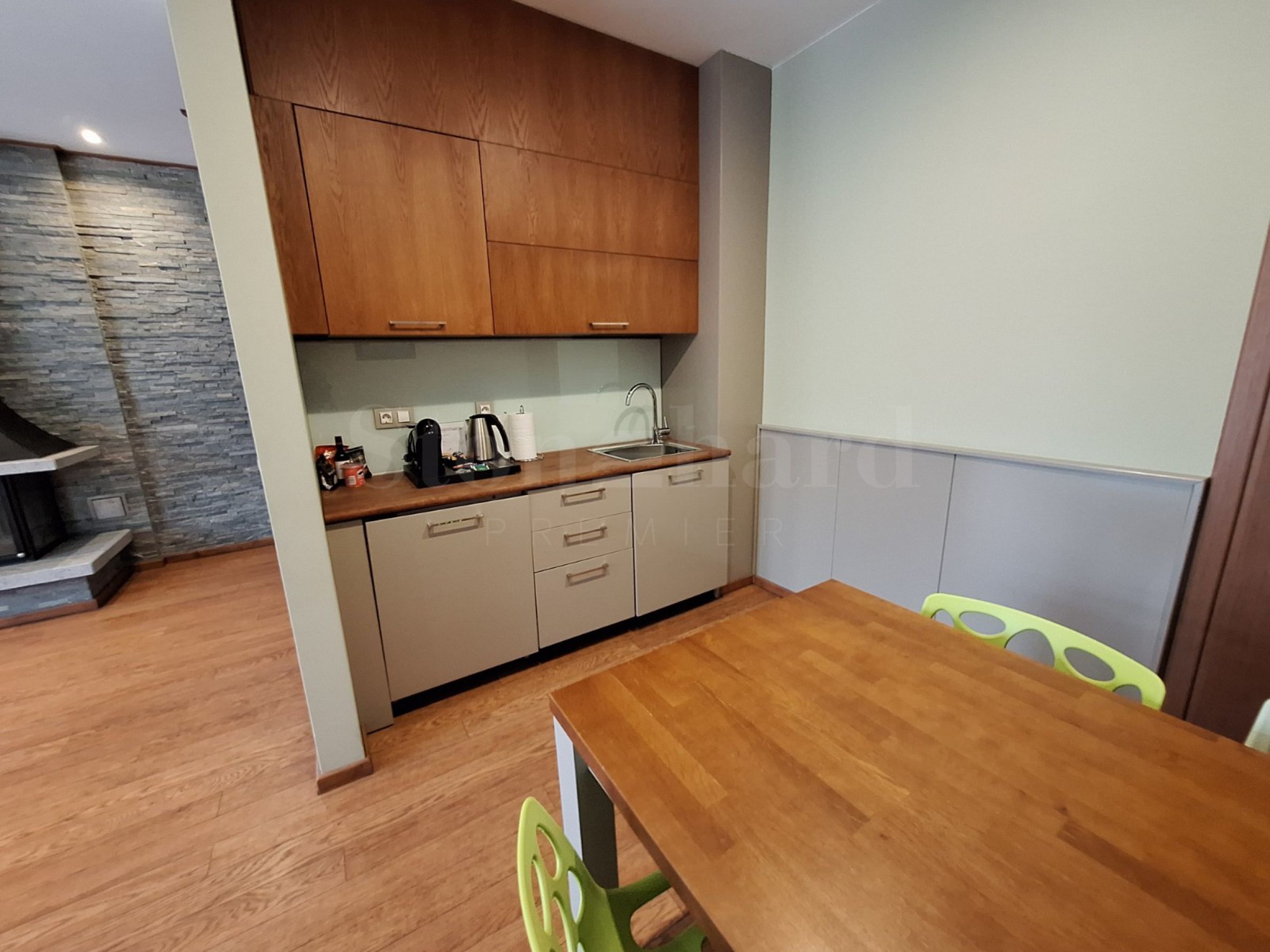 Просторная гостиная с камином, столовая, мини-кухня;