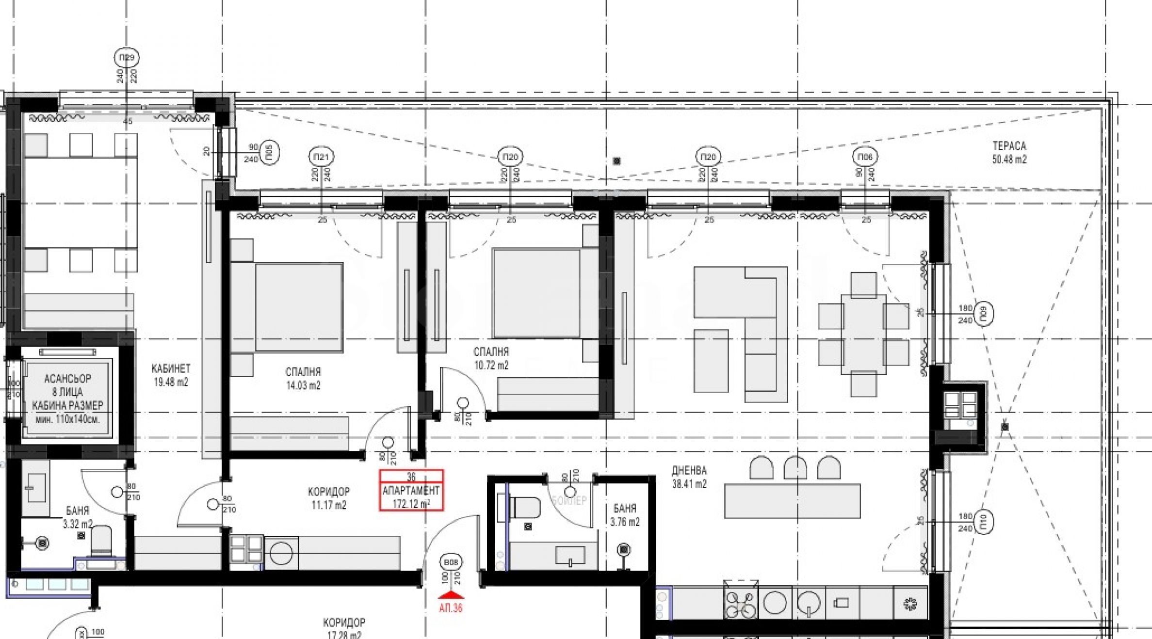 Квартира № 36 расположена на 4 этаже здания и имеет площадь 172,12 м2. Планировка: прихожая/коридор, ванная комната/туалет, гостиная с кухней и столовой, три спальни, одна из которых со своей ванной комнатой/туалетом, просторная терраса, окружающая квартиру, с выходом из гостиной и всех спален. В стоимость квартиры входит терраса площадью 50,48 м2. и кладовая площадью 2,79 м2.