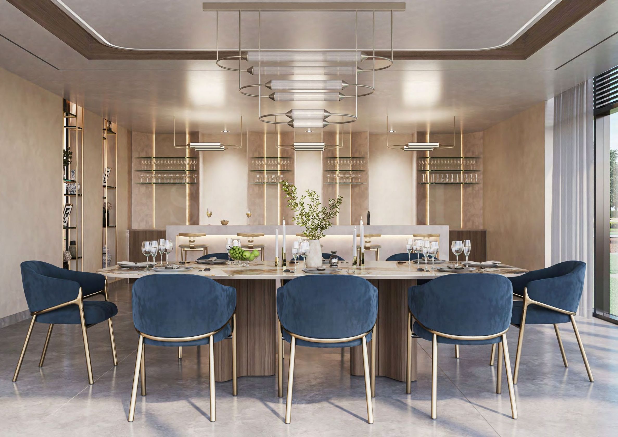 Элегантно оформленные, с высокими потолками и обилием естественного света, жилые зоны создают просторную и уютную атмосферу. Каменный обеденный стол добавляет изысканности, а модульный диван, современные прикроватные столики и мягкие ковры создают стильную и уютную атмосферу. Продуманное расположение полок и элегантная тумба под телевизор сочетают в себе форму и функциональность, делая это пространство идеальным местом как для отдыха, так и для развлечений.