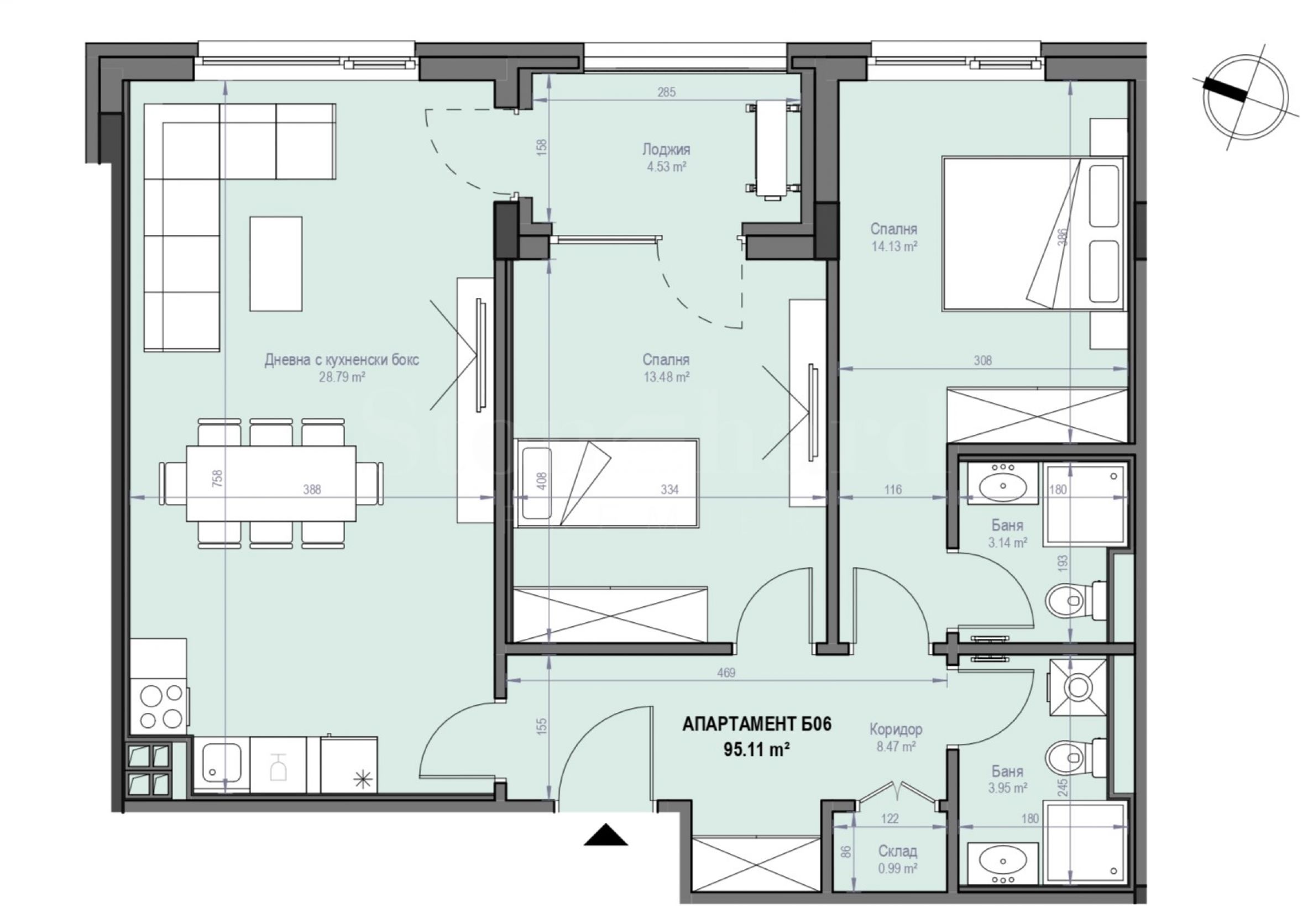 • Планировка: прихожая, ванная/туалет, гостиная с кухней и столовой, кладовая, одна спальня с собственной ванной комнатой, вторая спальня, терраса-лоджия, с выходом из обеих комнат;