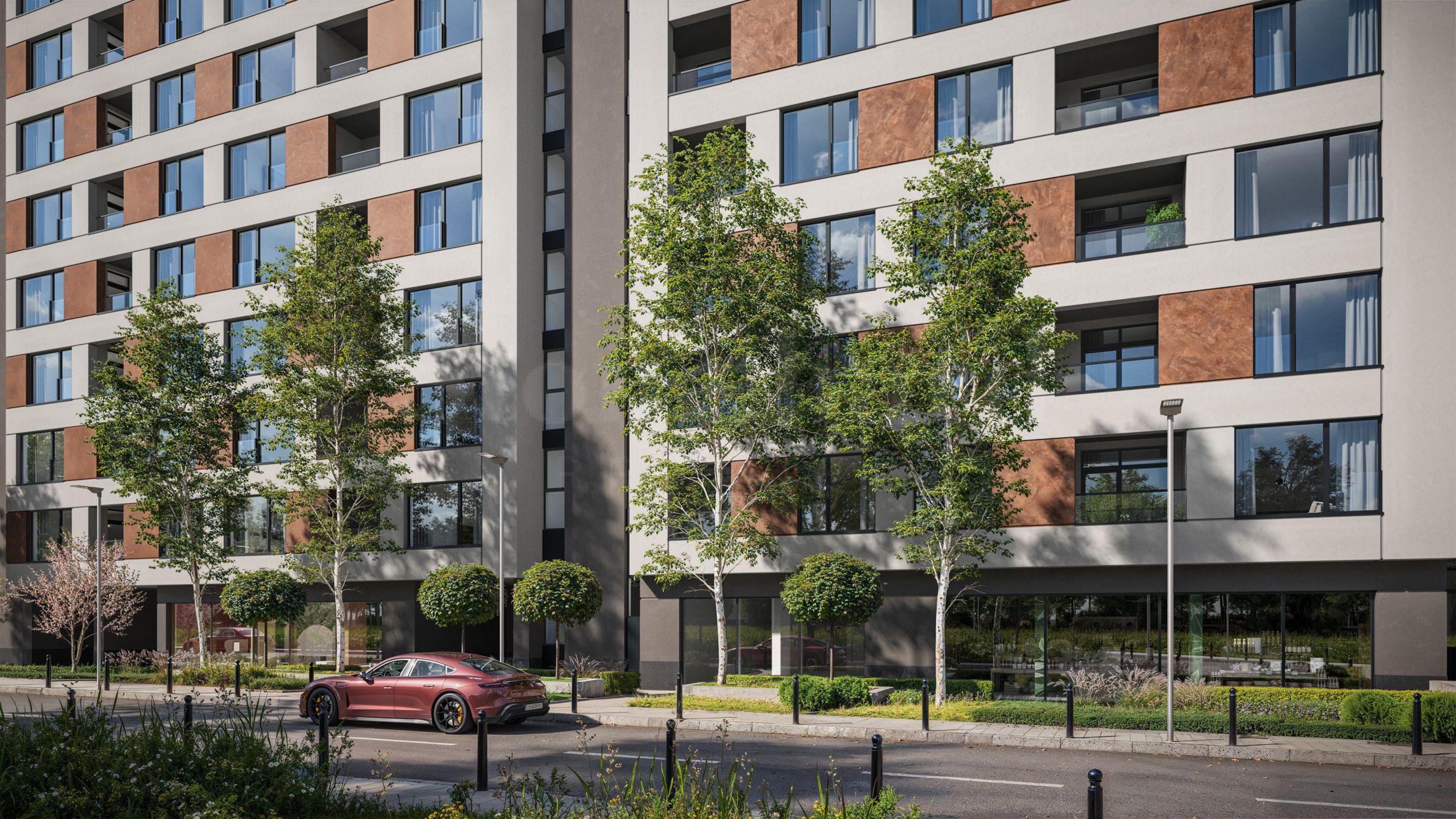 • Фасад выполнен из высококачественных материалов - вентилируемой керамической облицовки, теплоизоляции EPS и минеральной штукатурки, которые обеспечивают защиту и стильный вид.