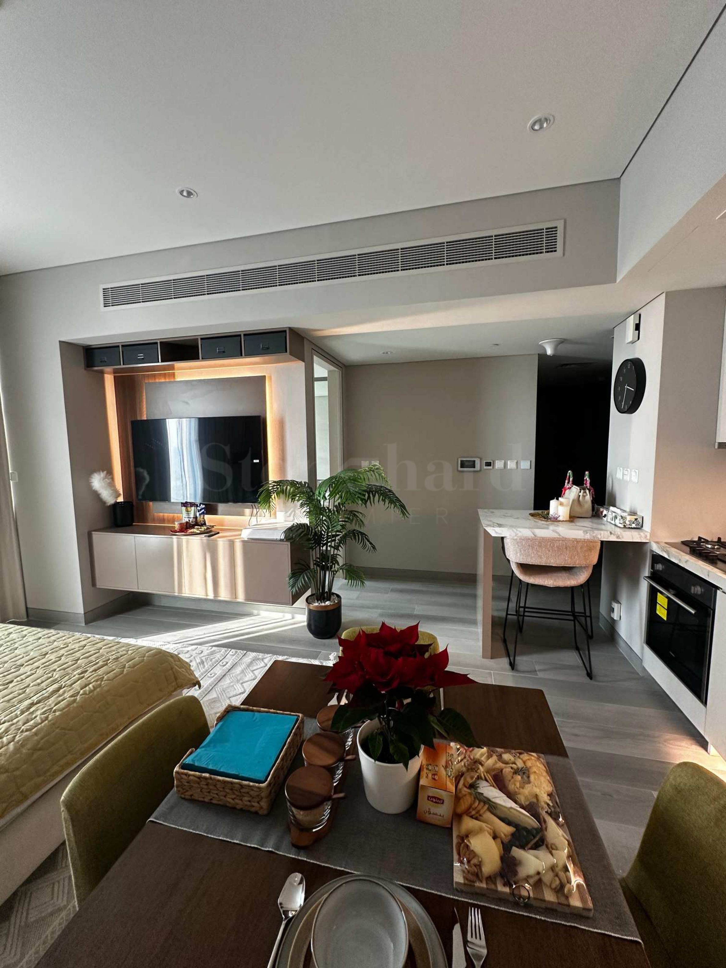 Расположенная на 13 этаже, эта студия площадью 48,22 кв. м сочетает в себе стиль, комфорт и оптимальное использование пространства. Внутренняя планировка спроектирована с чувством элегантной функциональности - современная кухня с барной стойкой, которая визуально образует границу с гостиной и спальной зонами. Пространство наполнено естественным светом, благодаря большим французским окнам, открывающим вид на яхтенную марину и море.