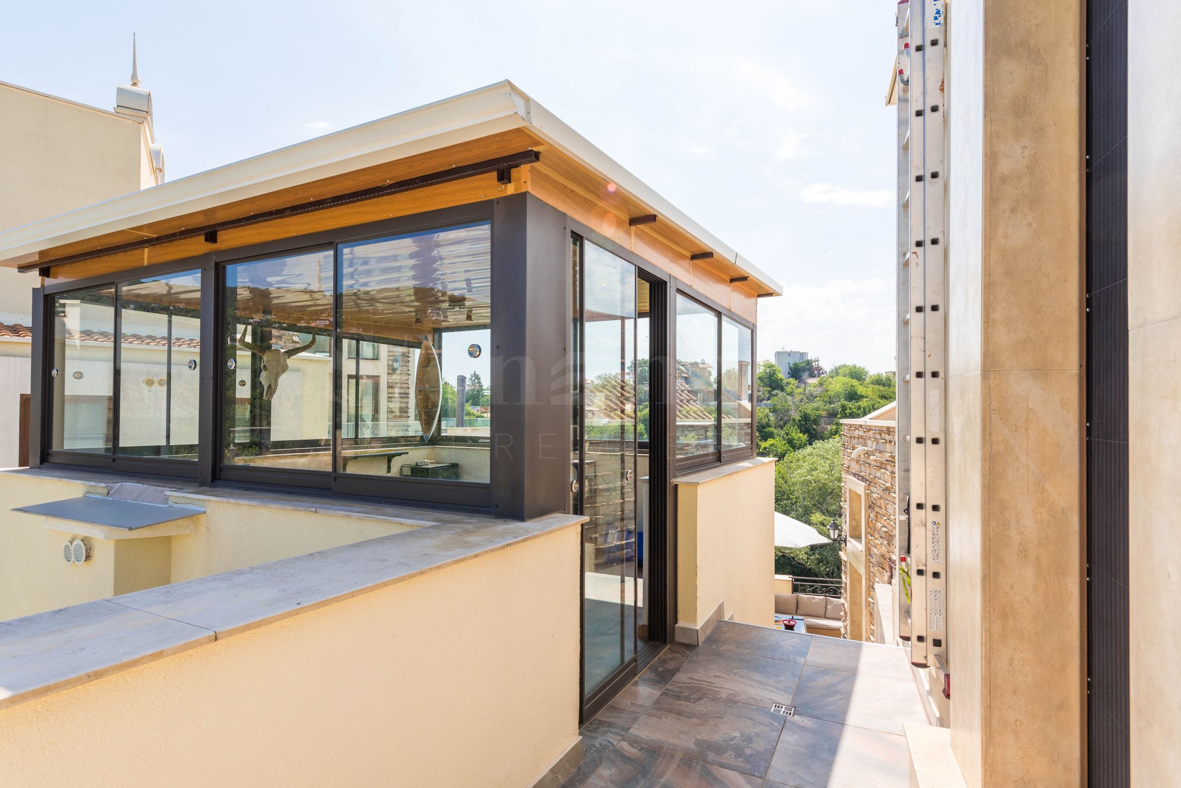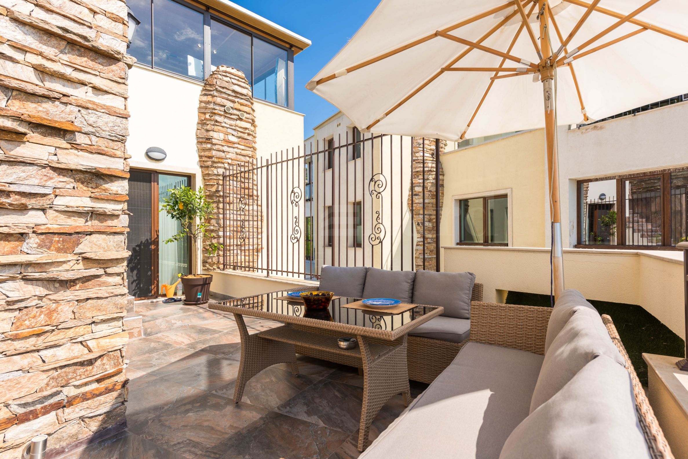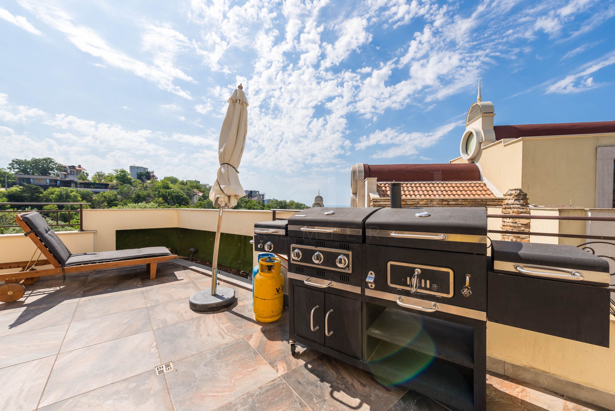 Пентхаус выполнен в дизайнерском стиле и обставлен качественными материалами и функциональной мебелью. Кухонные шкафы изготовлены из массива дерева, а электроприборы – от известного немецкого производителя. На террасе с панорамным видом на море расположен профессиональный барбекю с оборудованной зоной для приятных обедов и ужинов в кругу семьи и друзей. Открытая терраса на первом этаже также подходит для летнего загара.