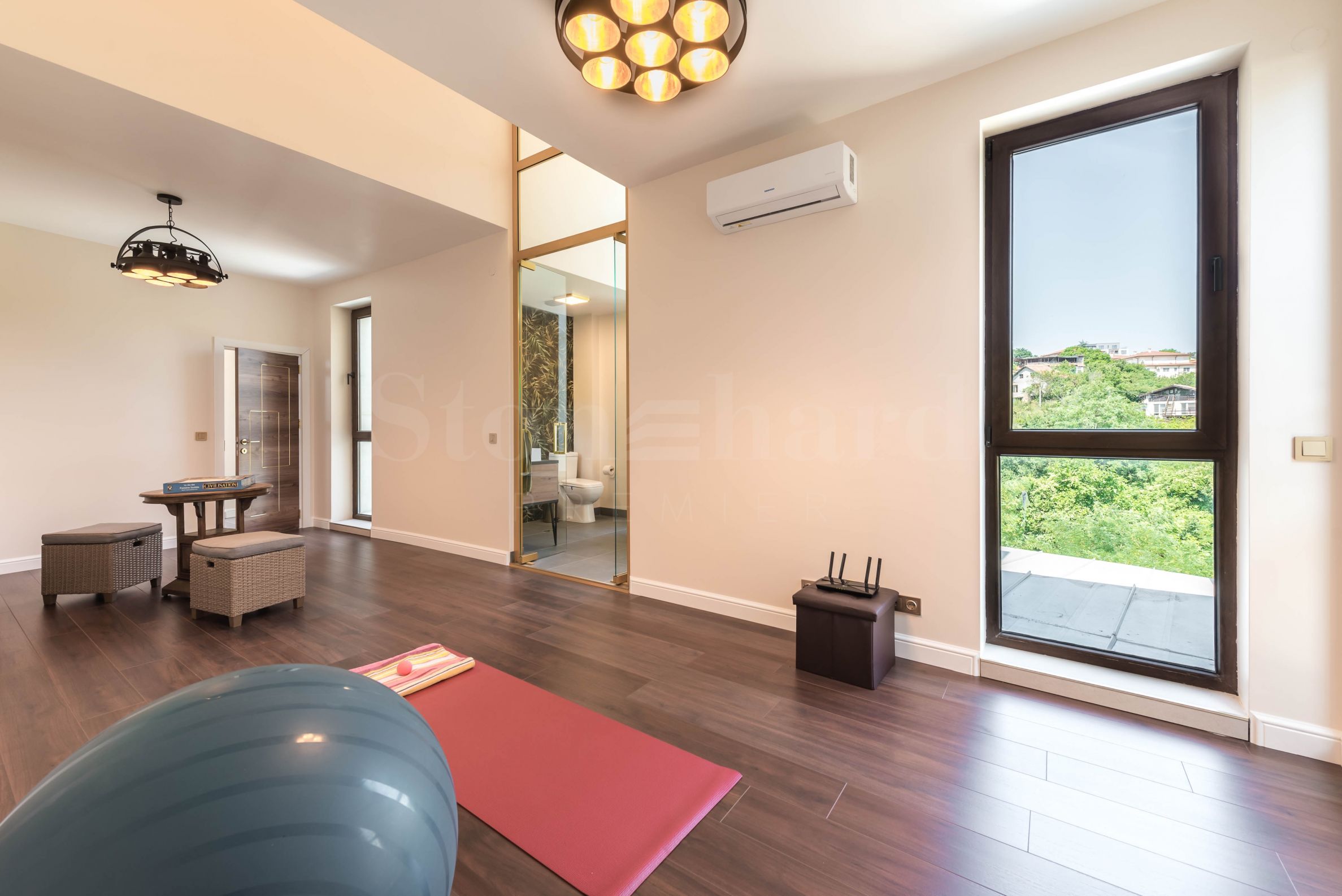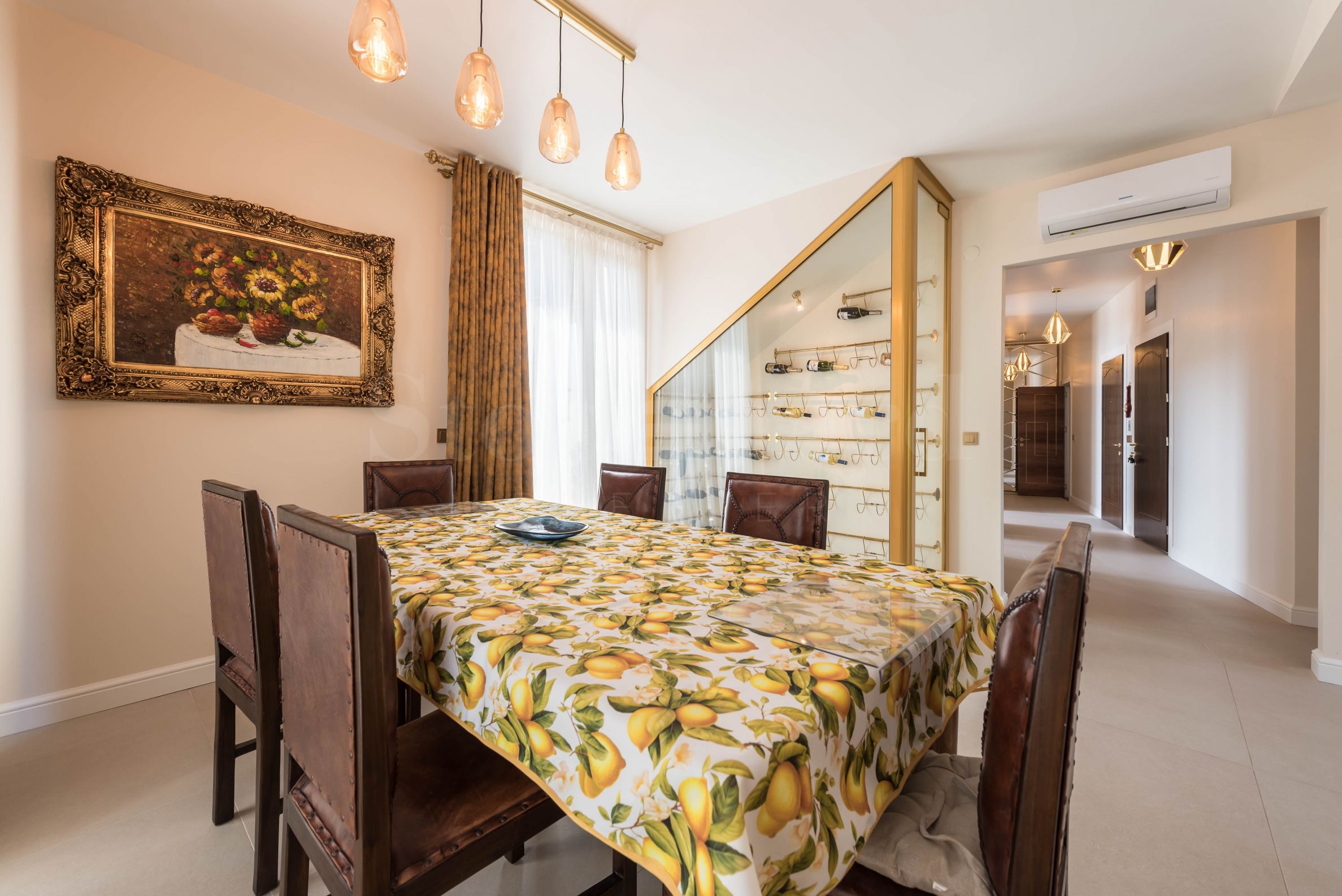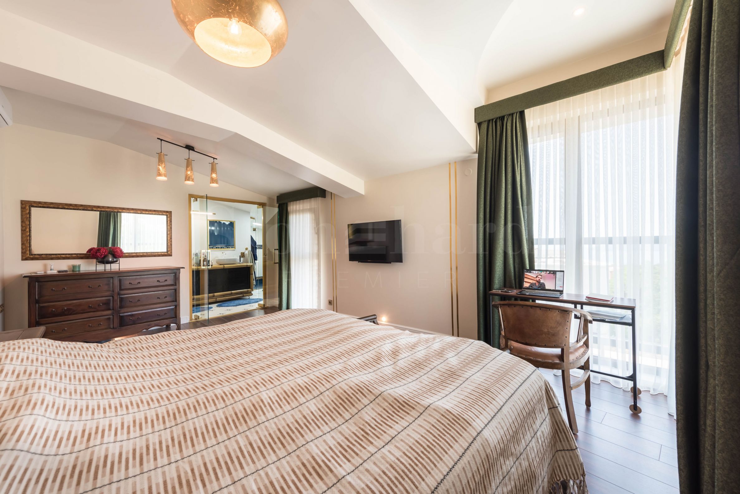 Пентхаус выполнен в дизайнерском стиле и обставлен качественными материалами и функциональной мебелью. Кухонные шкафы изготовлены из массива дерева, а электроприборы – от известного немецкого производителя. На террасе с панорамным видом на море расположен профессиональный барбекю с оборудованной зоной для приятных обедов и ужинов в кругу семьи и друзей. Открытая терраса на первом этаже также подходит для летнего загара.