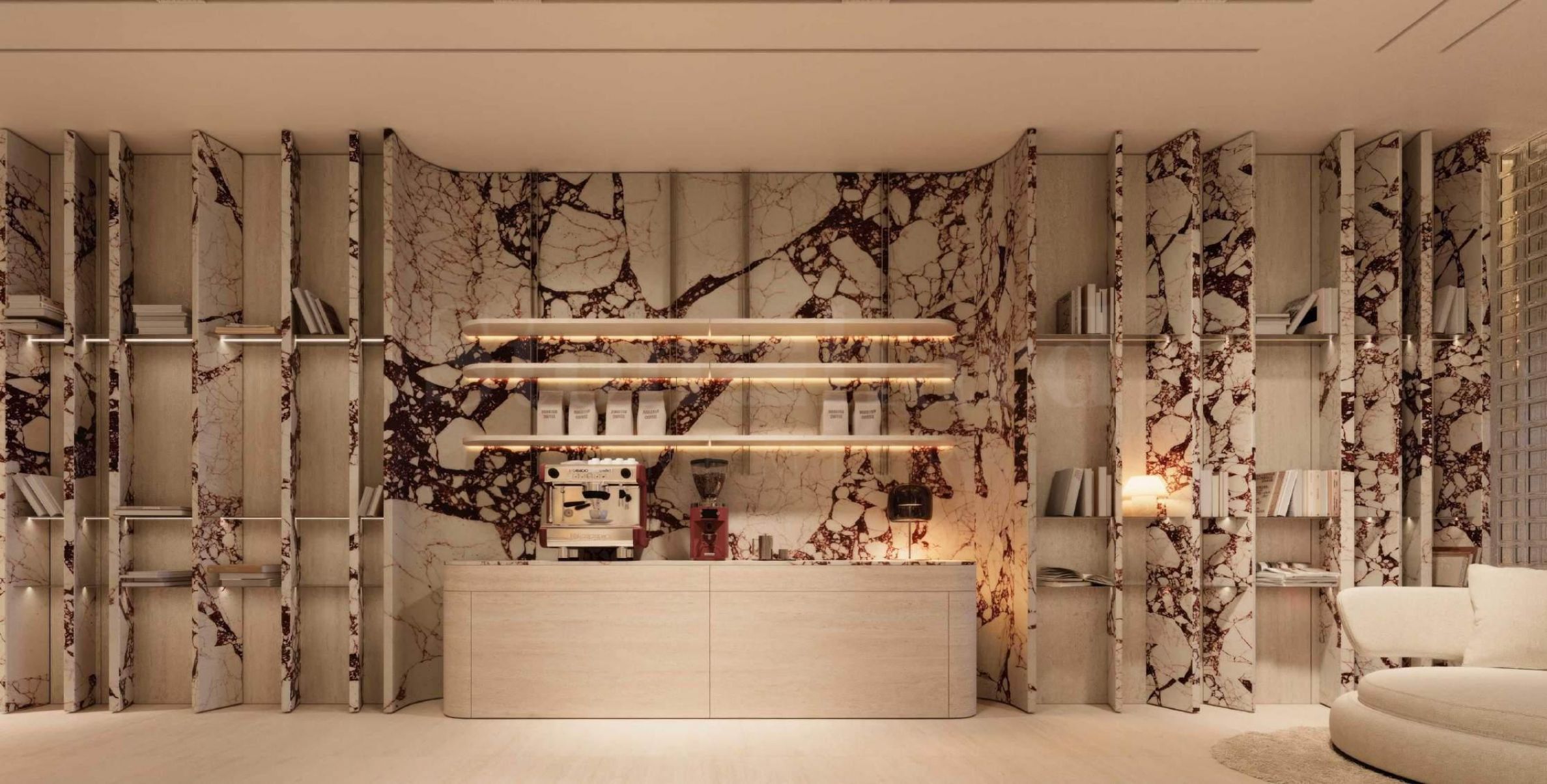 Лобби встречает гостей исключительно просторным и впечатляющим интерьером с меблировкую Cassina и стеклянными стенами чешского бренда Lasvit. В оформлении стен также использованы элементы из натурального камня, которые не только придают общему облику изысканность, но и создают ощущение единения с природой. Ощущение уюта и комфорта окутывает вас в лаунж-зонах для отдыха и встреч с друзьями и соседями, а кофе-бар будет ждать вас каждый день, чтобы зарядиться энергией на целый день.
