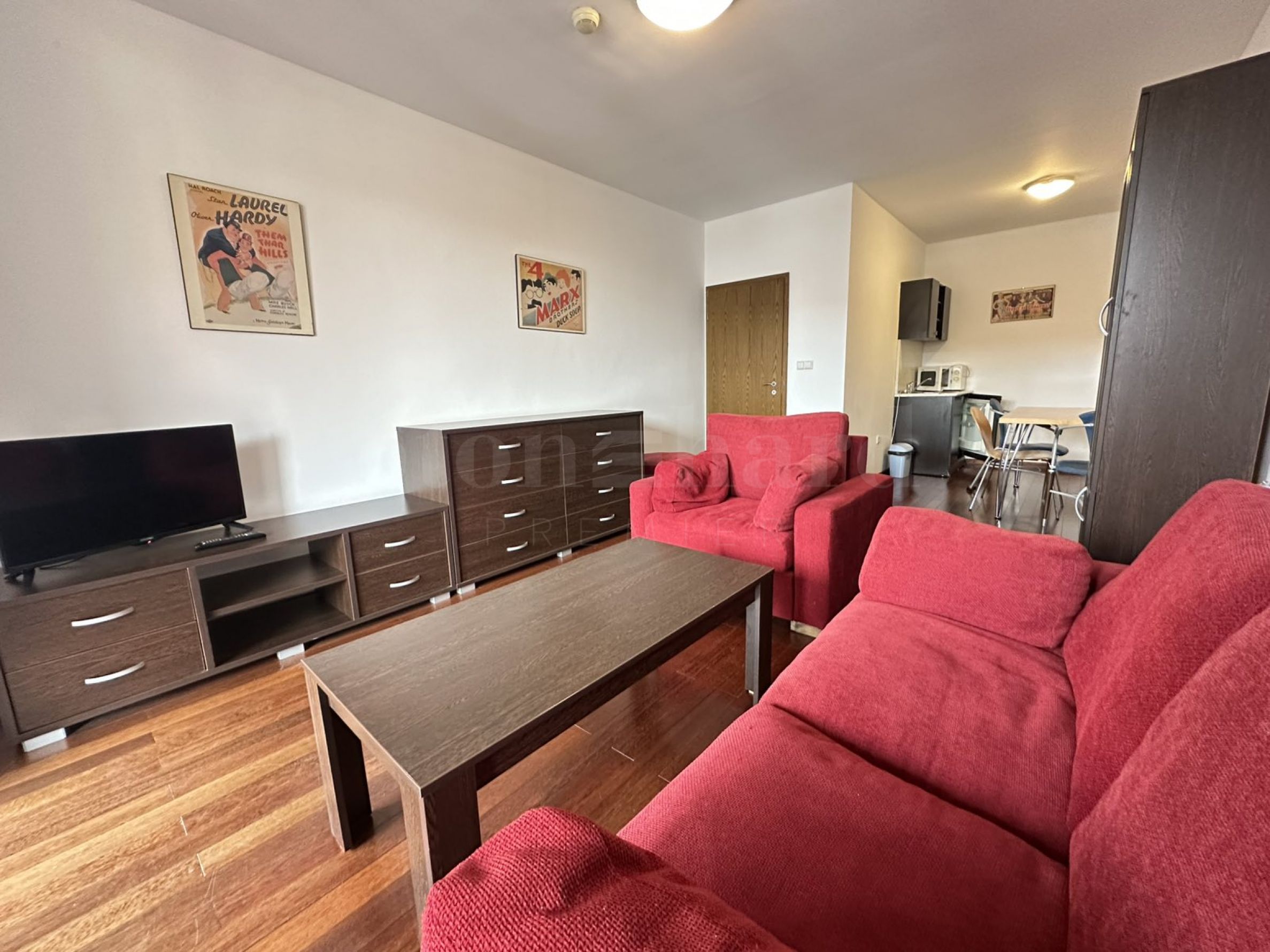 Гостиная с диваном, журнальным столиком, тумбой под ТВ и телевизором;