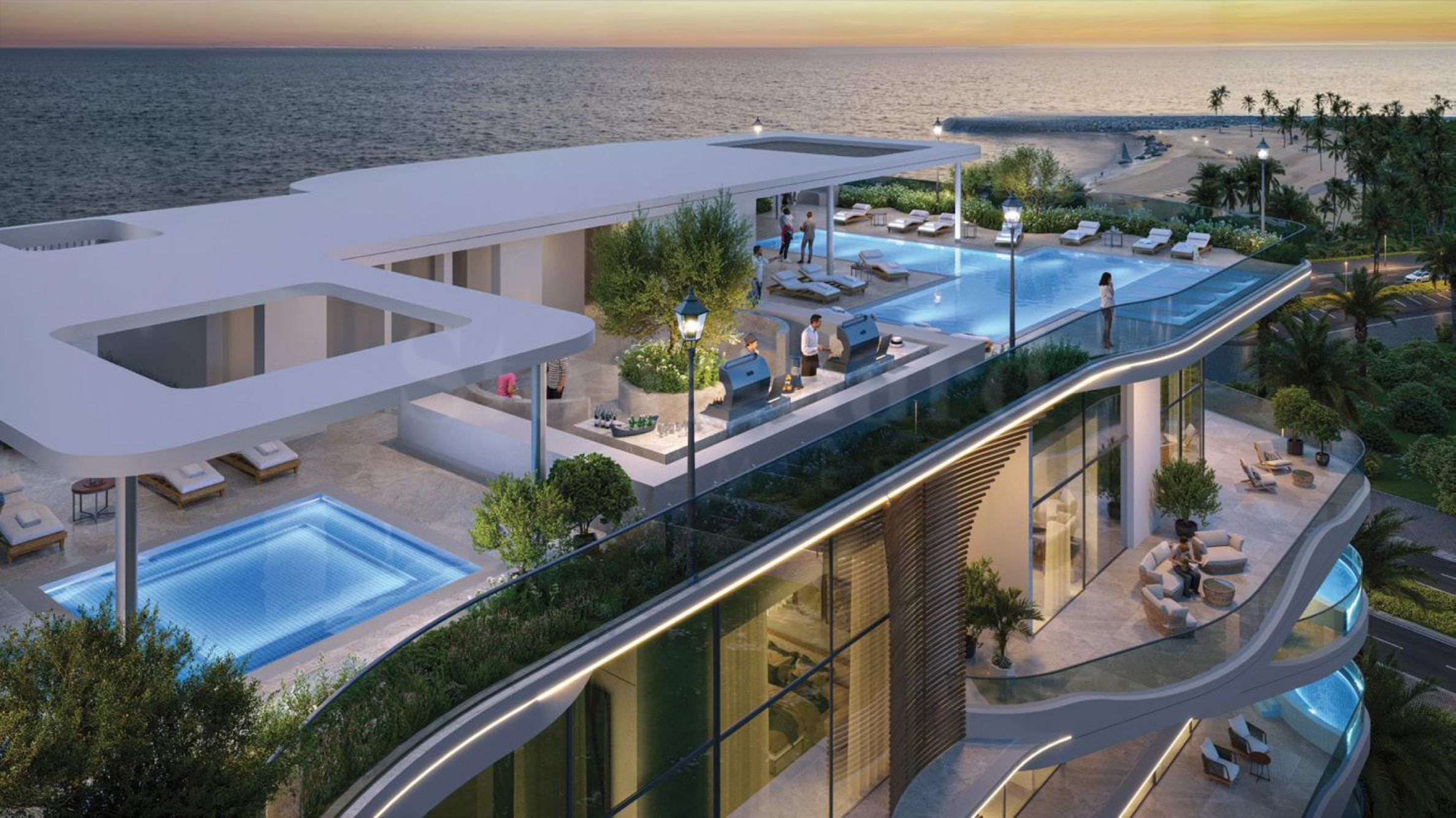 Жилой комплекс La Perla занимает 7 этажей, а его архитектура вдохновлена ласковыми волнами океана. Мягкие перепады высот, плавные линии и обилие стекла – элегантный облик здания обусловлен дальновидным мышлением, использованием высококачественных материалов и вниманием к каждой детали. Вестибюль здания встречает вас высокими потолками и элегантной мебелью, а также стойкой регистрации, где вы можете обратиться за помощью или обслуживанием к отзывчивому персоналу La Perla. Здесь же находится вход в чудесный сад, где есть зоны для отдыха и релаксации в тени, а великолепный фонтан не только создает романтическую атмосферу, но и дарит прохладу в жаркие дни. К услугам жильцов великолепный бассейн с шезлонгами и зонтиками – идеальное место как для купания, так и для отдыха на солнце. В здании также есть замечательный ресторан, полностью оборудованный тренажерный зал и СПА-зона с джакузи, паровой баней и сауной – удобства, которые превращают каждый день в незабываемое событие. Для самых маленьких жильцов предусмотрены возможности для развлечений: детский бассейн рядом со взрослым бассейном, а также дополнительные игровые площадки.