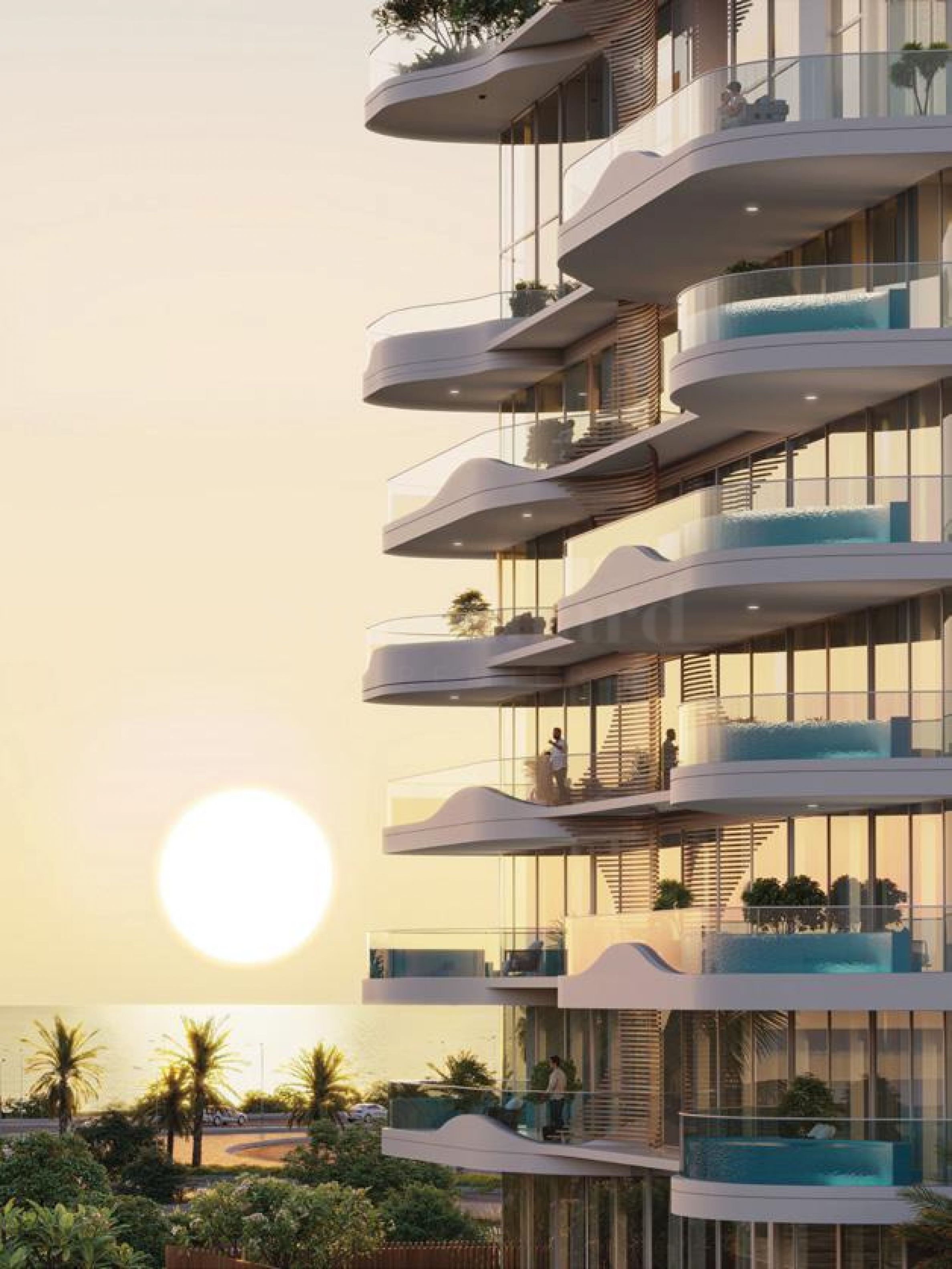 La Perla — это семиэтажное бутик-здание, вдохновлённое плавным движением морских волн. Оно сочетает в себе элегантную архитектуру, обилие стекла и естественного света. Вестибюль встречает жильцов высокими потолками, изысканным интерьером и стойкой регистрации с профессиональным и дружелюбным персоналом.