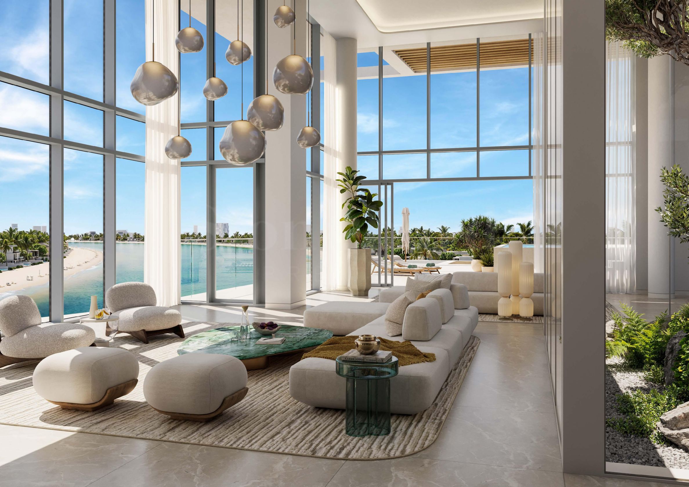 Архитектура комплекса продумана таким образом, что каждый дом имеет террасу и вид на море и пляж – привилегия, которая превращает повседневную жизнь в постоянное ощущение отпуска. В некоторых апартаментах есть дополнительная комната для личного персонала, а четырёх- и пятикомнатные резиденции впечатляют просторными открытыми пространствами, превышающими стандартные размеры.