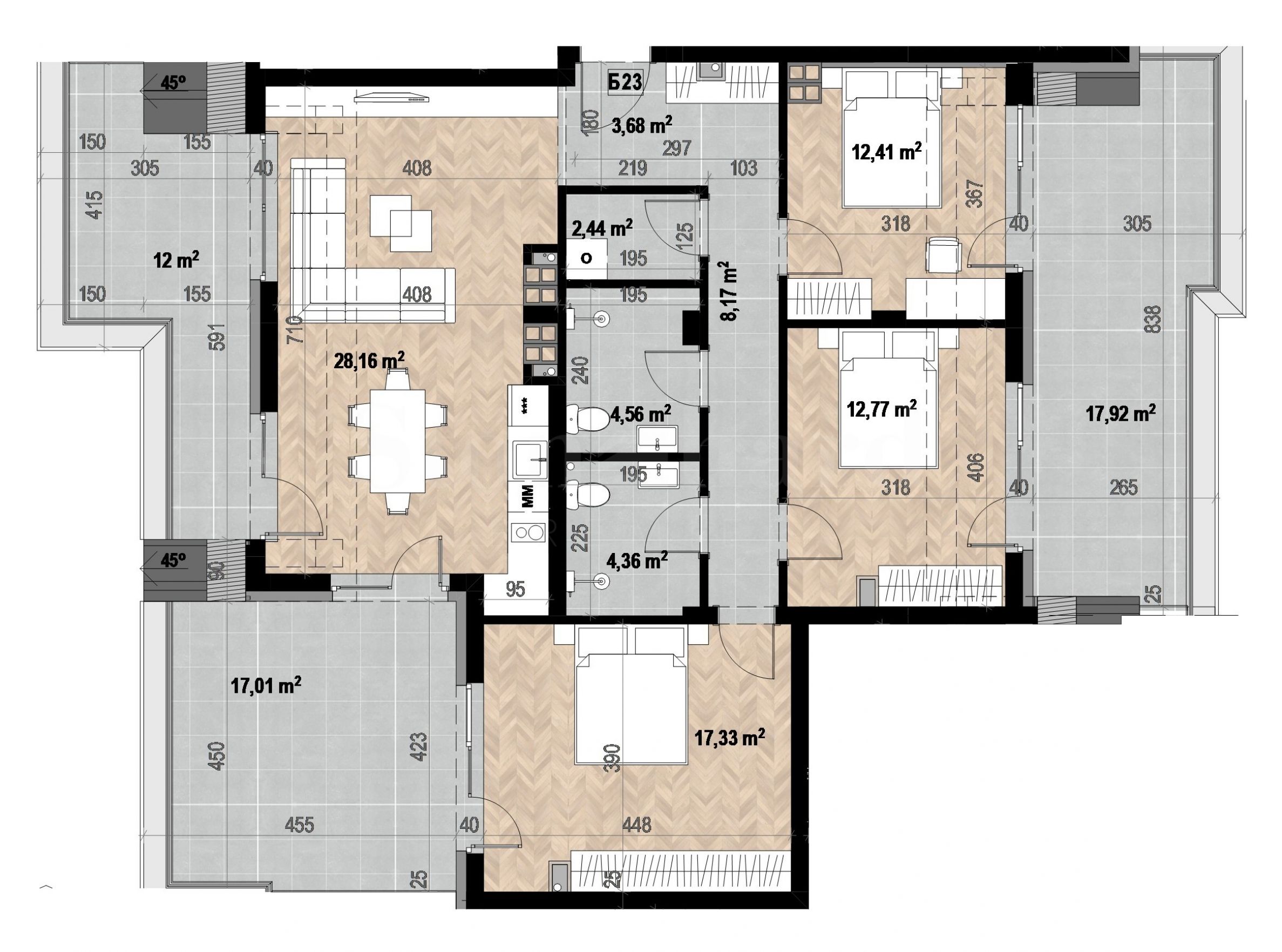 Здание имеет два входа и в общей сложности 68 квартир, а также просторную общую подземную парковку. Каждая квартира спроектирована функционально с оптимальной планировкой, которая максимально использует внутреннее пространство и уменьшает площадь общих зон. Это обеспечивает реальную ценность каждого квадратного метра.