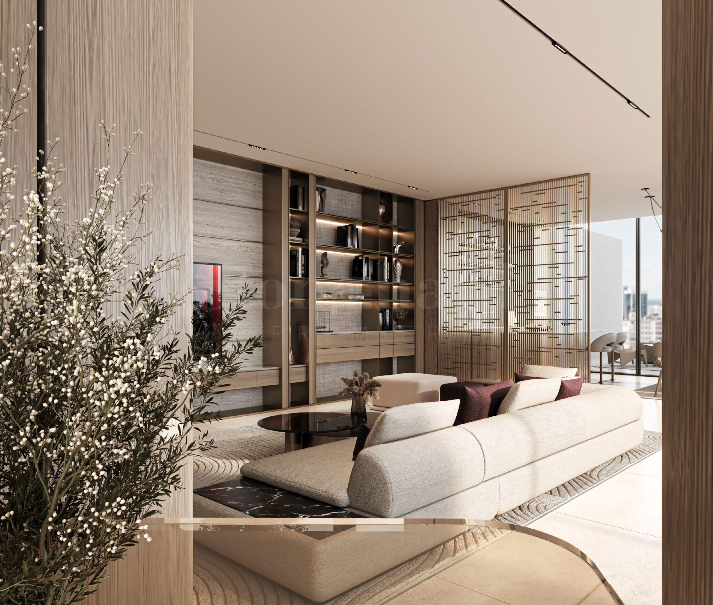 Представляем функциональную и стильную однокомнатную квартиру, расположенную на третьем этаже здания, общей площадью 86,11 кв. м, включая террасу площадью 21,46 кв. м. Планировка включает просторную гостиную с кухней и обеденной зоной, спальню, ванную комнату, отдельный гостевой туалет и террасу. Квартира спроектирована таким образом, чтобы обеспечить идеальный баланс между современной роскошью, комфортом и практичностью. Высокие потолки и панорамные окна от пола до потолка наполняют пространство естественным светом и создают приятное ощущение простора.