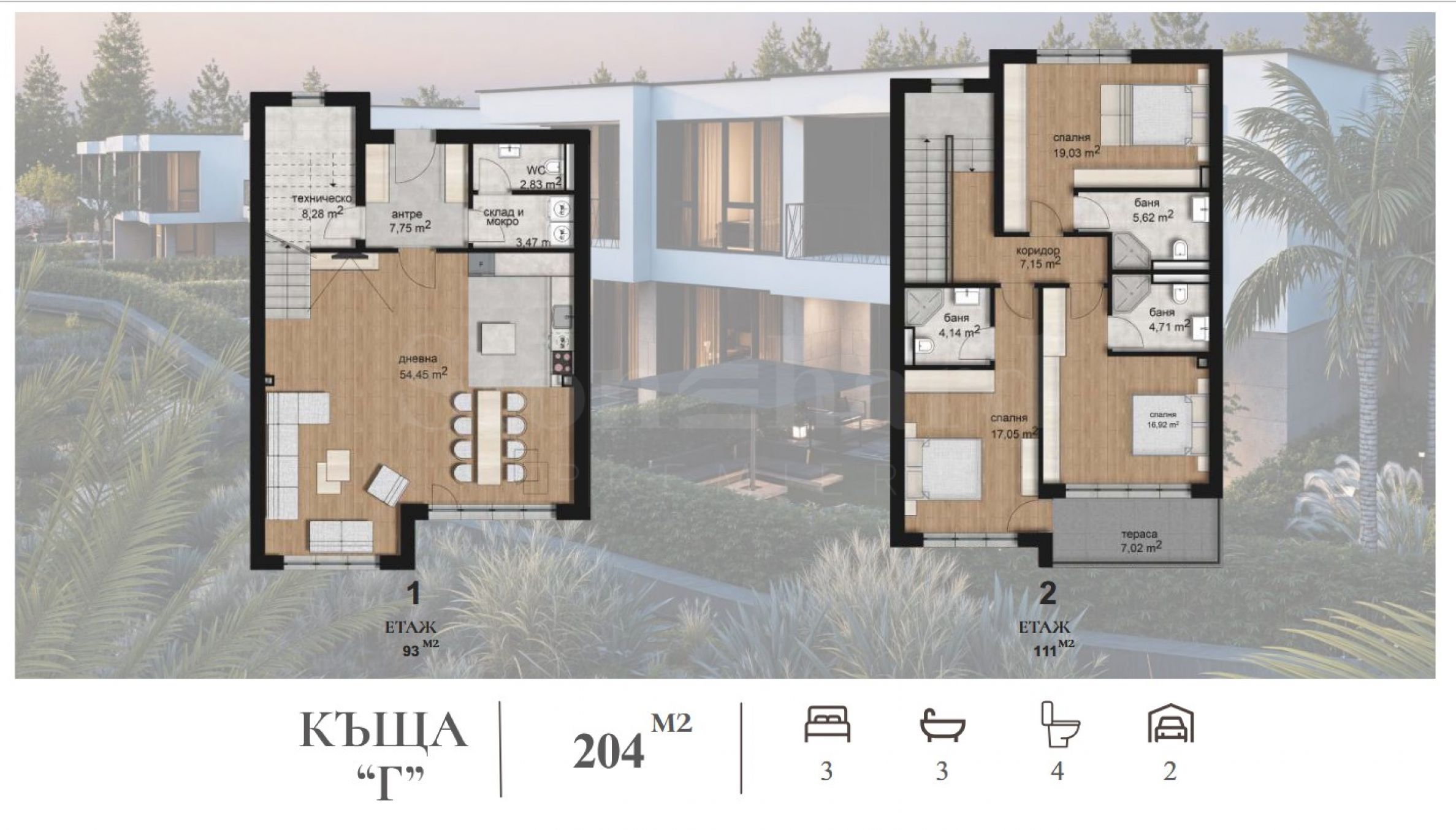 Общая площадь объекта недвижимости составляет 204 кв. м, собственный двор площадью 211 кв. м, с двумя парковочными местами и следующая функциональная планировка: