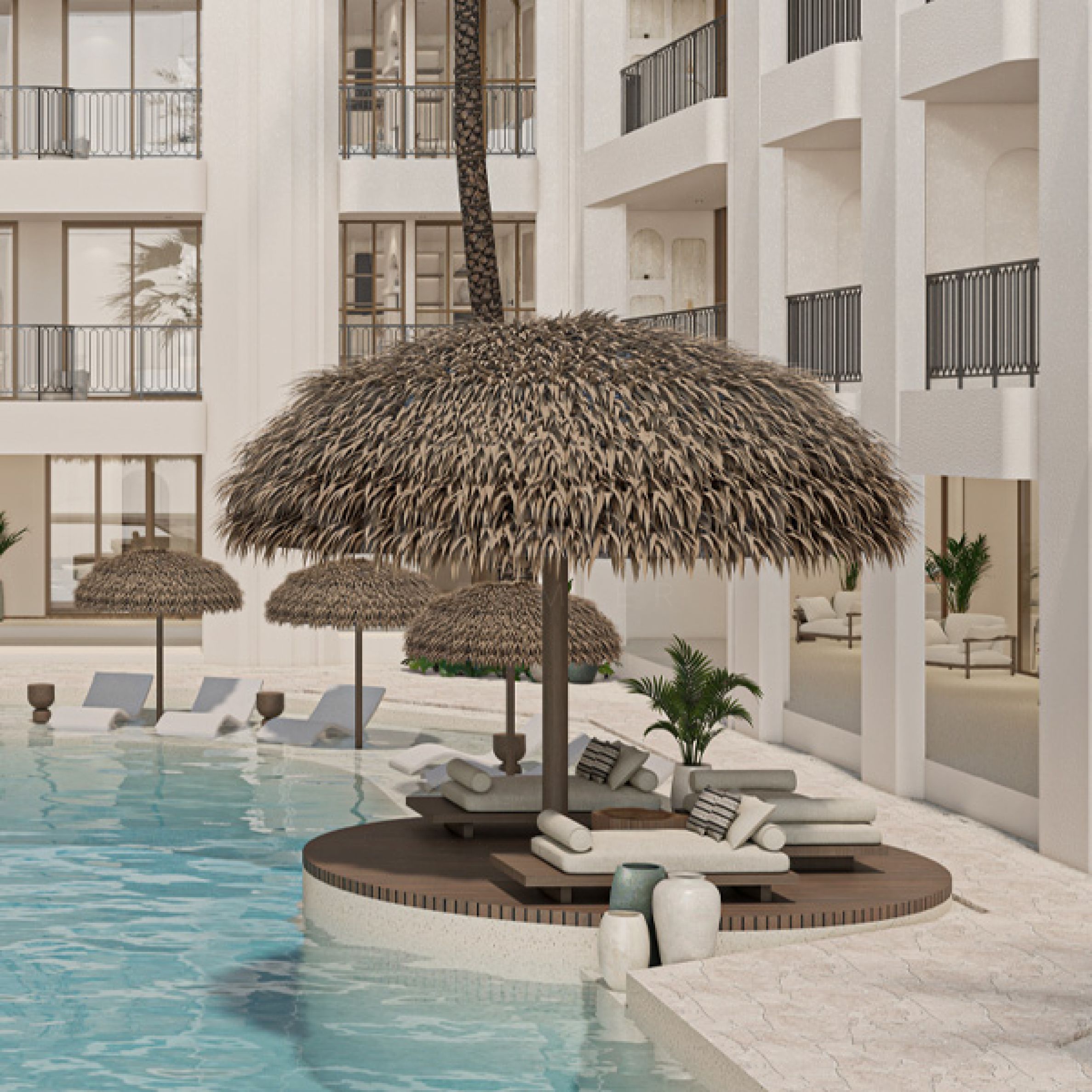 Комплекс предлагает ограниченное количество двухкомнатных апартаментов площадью 40 кв. м, спроектированных с учетом комфорта и функциональности. Планировка включает уютную гостиную с мини-кухней и барной стойкой, отдельную спальню и просторную солнечную террасу, на которой расположен частный бассейн для отдыха и расслабления жильцов.