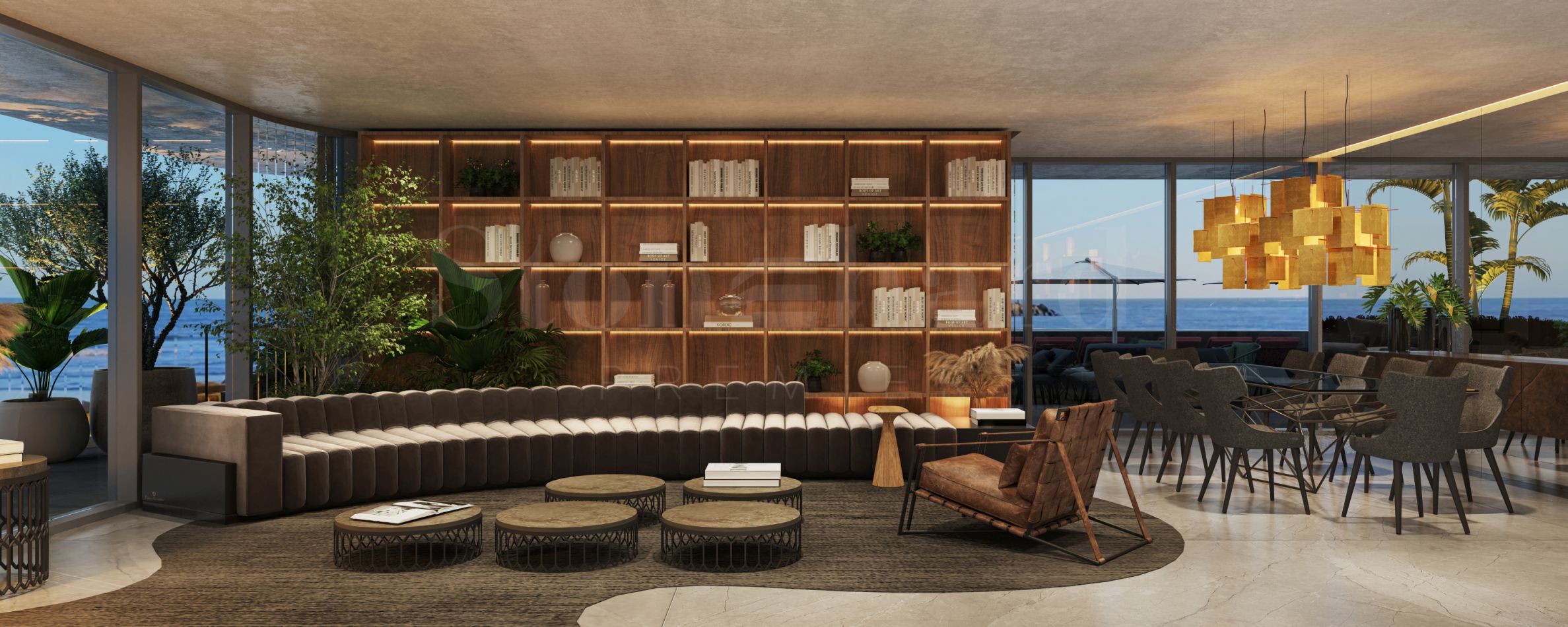 Акустический комфорт, мягкое освещение и продуманные переходы между материалами создают атмосферу спокойной сосредоточенности. Интерьеры задуманы как естественное продолжение дизайнерского языка Тонино Ламборгини – смелого, изысканного и сдержанно элегантного. Чистые архитектурные линии формируют просторные объемы, позволяющие свету свободно струиться по рельефным поверхностям и тщательно подобранной отделке. Сдержанная палитра теплых нейтральных тонов, дополненная едва заметными металлическими акцентами, создает гармонию с прибрежной средой, сохраняя при этом узнаваемый стиль.
