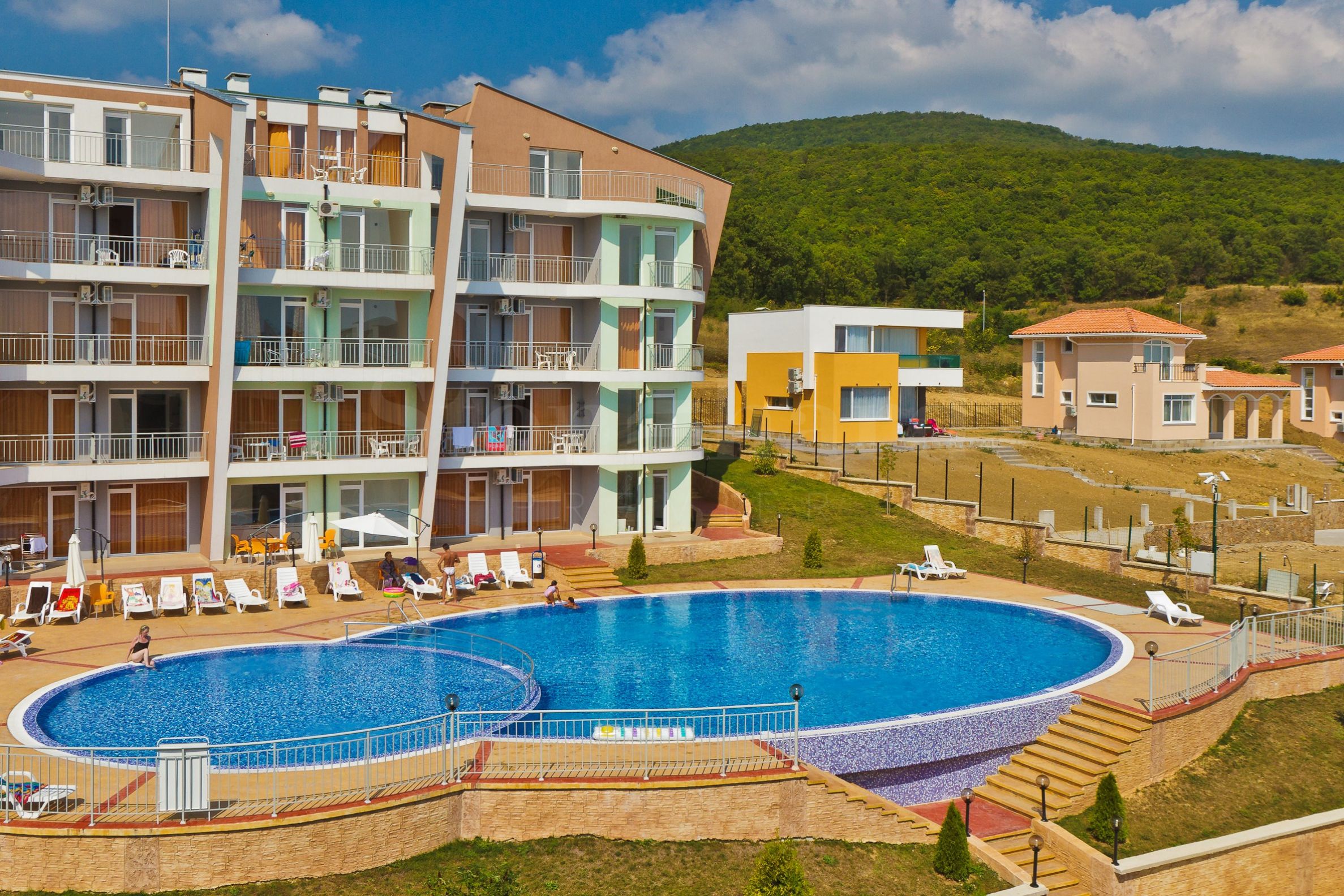 Студия с террасой в мини-курорте с бассейнами в Кошарице, недалеко от Солнечного Берега.