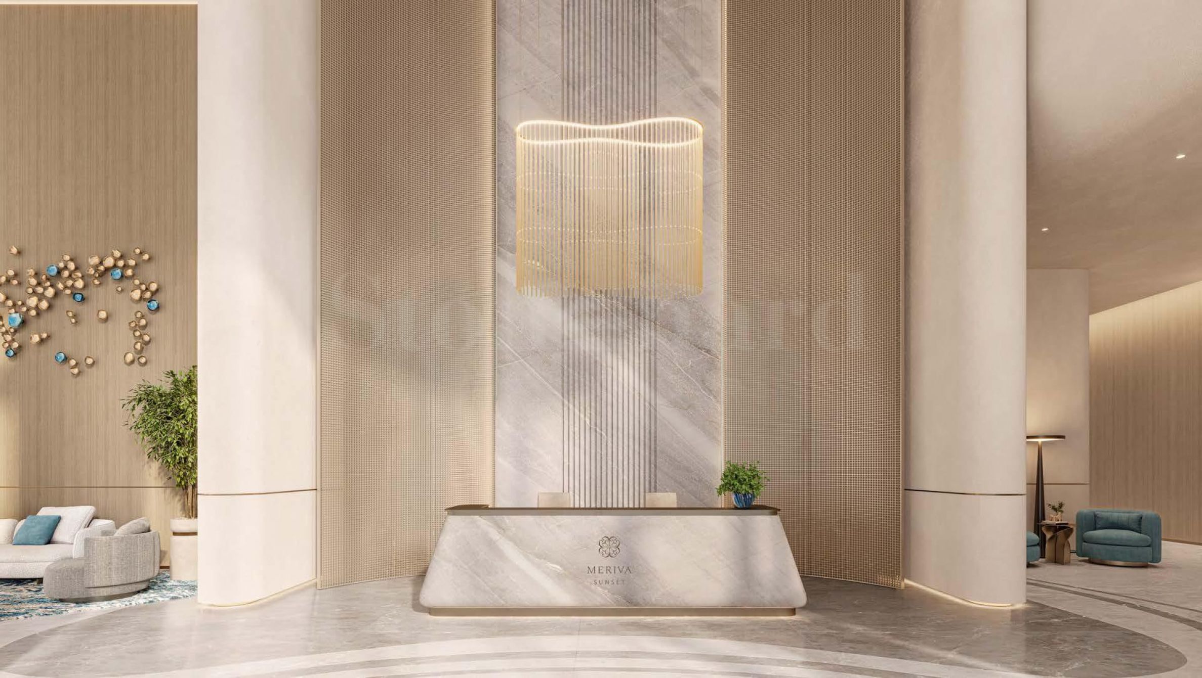 Жилой комплекс Meriva Sunset встречает своих жителей элегантной зоной высадки с впечатляющим фонтаном, ведущей в представительный холл с ресепшеном и просторной зоной отдыха. Высокие потолки и изысканный интерьер придают пространству ощущение света, стиля и престижа, сохраняя при этом теплую и гостеприимную атмосферу.