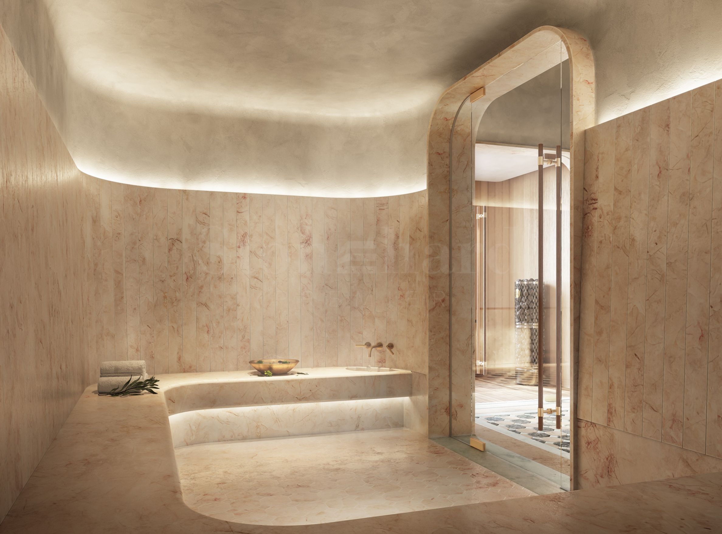 Ванные комнаты впечатляют своей элегантностью и точностью исполнения, являясь естественным продолжением зон гидротерапии в здании. Просторные изогнутые ванны, мягкие мраморные поверхности, латунные детали и тонко рифленое стекло создают ощущение уюта и расслабления. Каждая спальня имеет собственную ванную комнату, а главная спальня спроектирована как личный спа-оазис — с впечатляющей ванной, полом из травертина и стенами, отделанными керамогранитом цвета «грейдж оникс». Высококачественная сантехника и аксессуары от Dornbracht и Duravit дополняют общее впечатление, превращая ежедневные ритуалы в моменты истинного удовольствия.