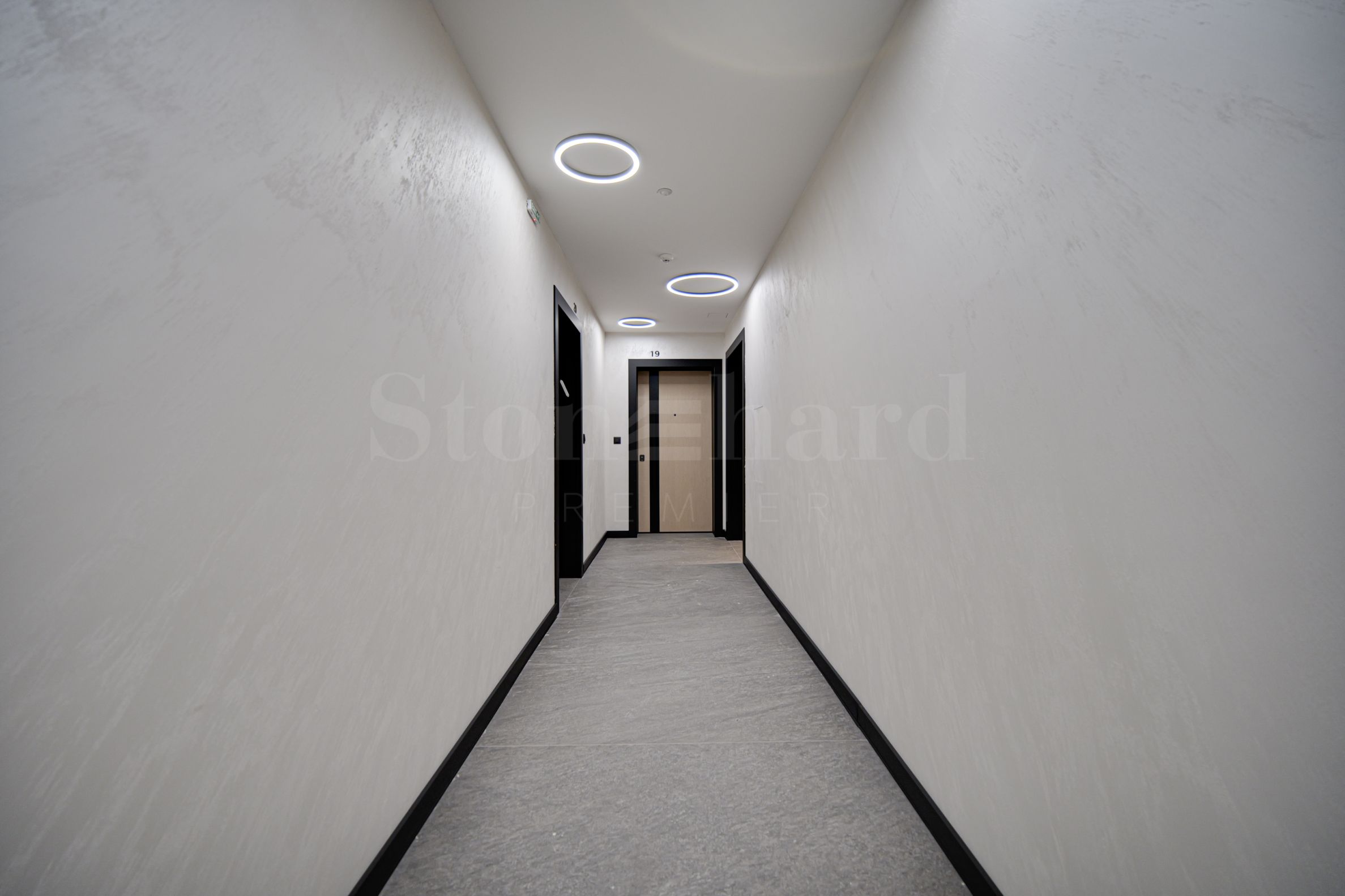 Квартира площадью 102,88 м2 впечатляет функциональной планировкой и исключительным ощущением простора и света благодаря панорамным французским окнам, высоким потолкам и западной ориентации. Из квартиры открывается прекрасный вид на гору Витоша, что способствует ощущению покоя и комфорта.