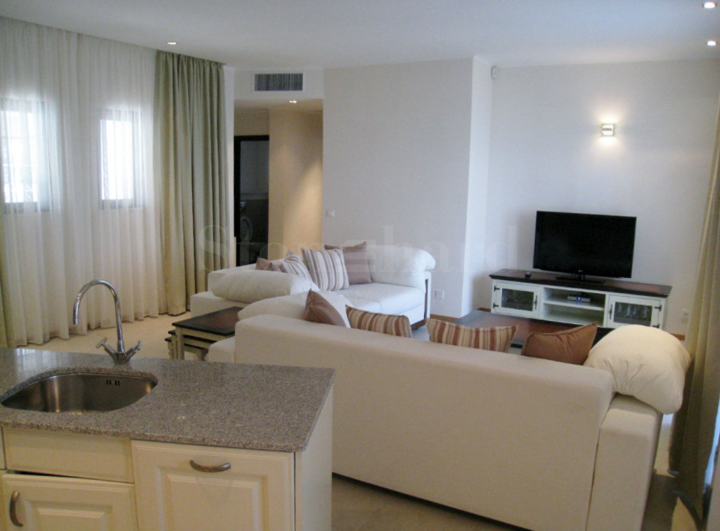 Квартира расположена на третьем этаже. Общая площадь квартиры составляет 132.78 кв.м, включая 18,74 кв.м общих частей. Квартира с интересной и функциональной планировкой, которая позволит насладиться простором и уютом. Прихожая ведет в огромную гостиную, которая включает в себе кухню открытого плана, столовую и зону для отдыха. Справа по коридору находится спальня с собственной ванной комнатой (с душ-кабиной) и выходом на широкий балкон, подходящий для обедов на открытом воздухе. Другая дверь ведет в родительскую спальню, с собственной ванной комнатой (с ванной) и собственным балконом. В квартире также есть дополнительный, гостевой туалет. Квартира полностью меблирована и оснащена всей необходимой бытовой техникой. Использованы натуральные отделочные материалы, такие как гранит и дерево.