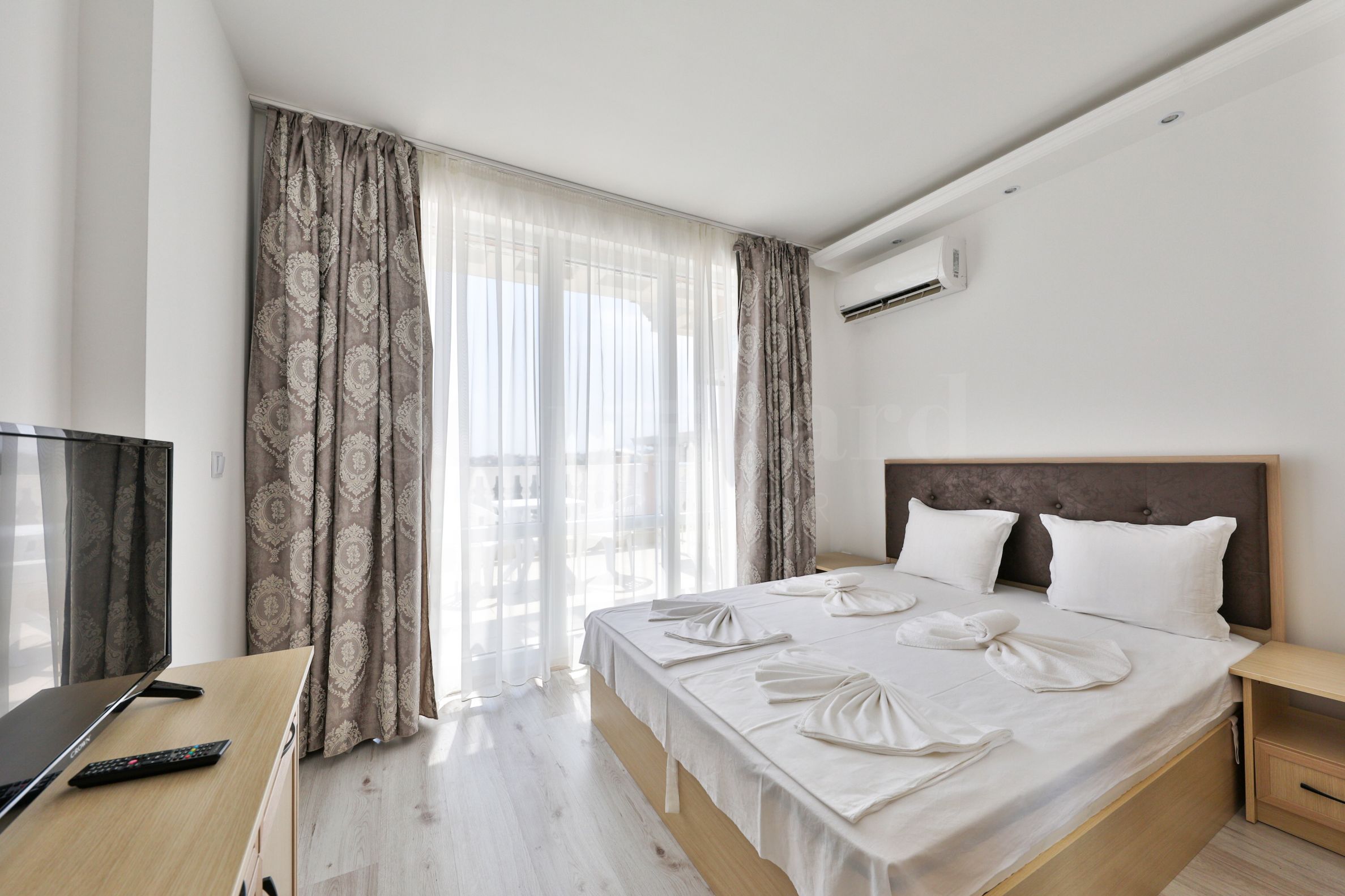 Он ориентирован на пляж и предлагает потрясающий вид на море и пляж. На территории есть все необходимые удобства для приятного отдыха, в том числе бассейн, подземный паркинг и ресторан. Есть охрана, видеонаблюдение и рецепция. Недвижимость подходит как для летнего отдыха, так и для круглогодичного проживания. Учитывая привлекательное расположение рядом с пляжем, апартаменты являются хорошим выбором для инвестиций.