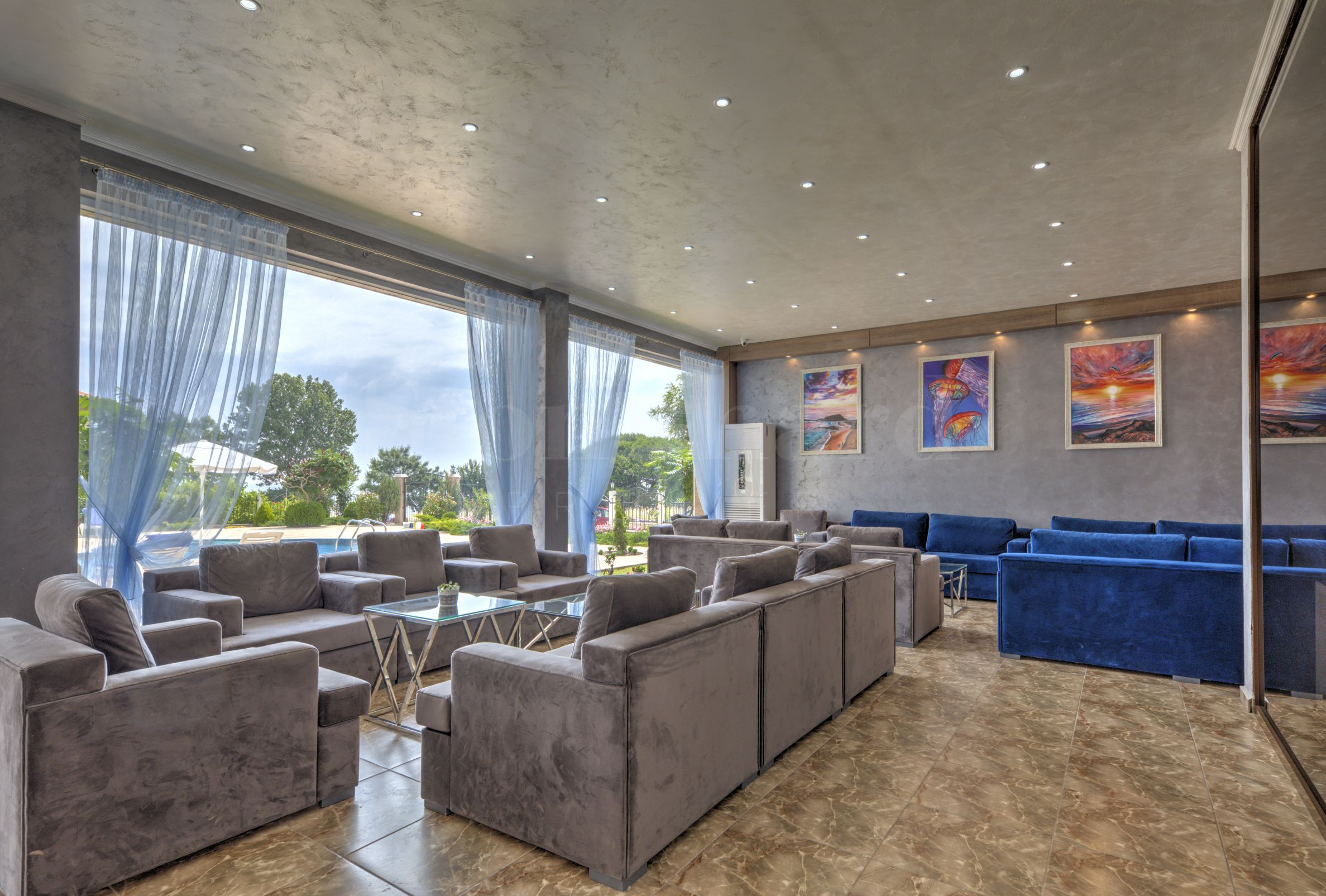 Здание выделяется своей утонченной и элегантной архитектурой, с просторными террасами с балюстрадами. Он ориентирован на морское побережье и предлагает невероятные виды на море и пляж. На территории есть все удобства, необходимые для приятного отдыха: бассейн, подземный паркинг и ресторан, охрана, видеонаблюдение и ресепшн.