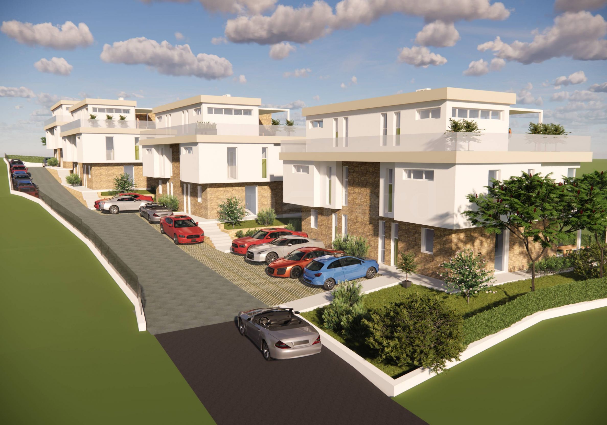 Свака кућа има приватно двориште (стварно коришћење), са 2 спољна паркинг места укључена у цену.