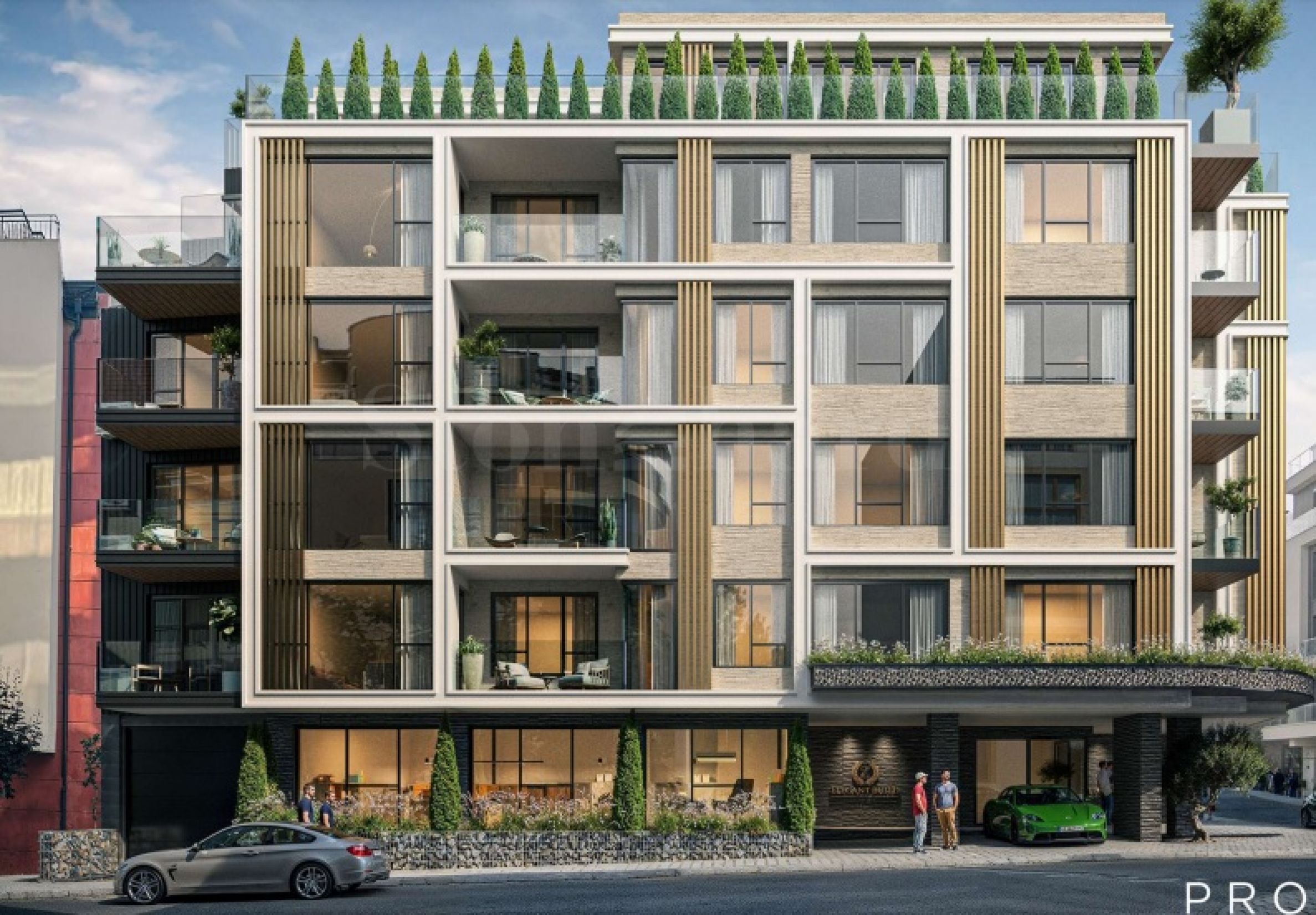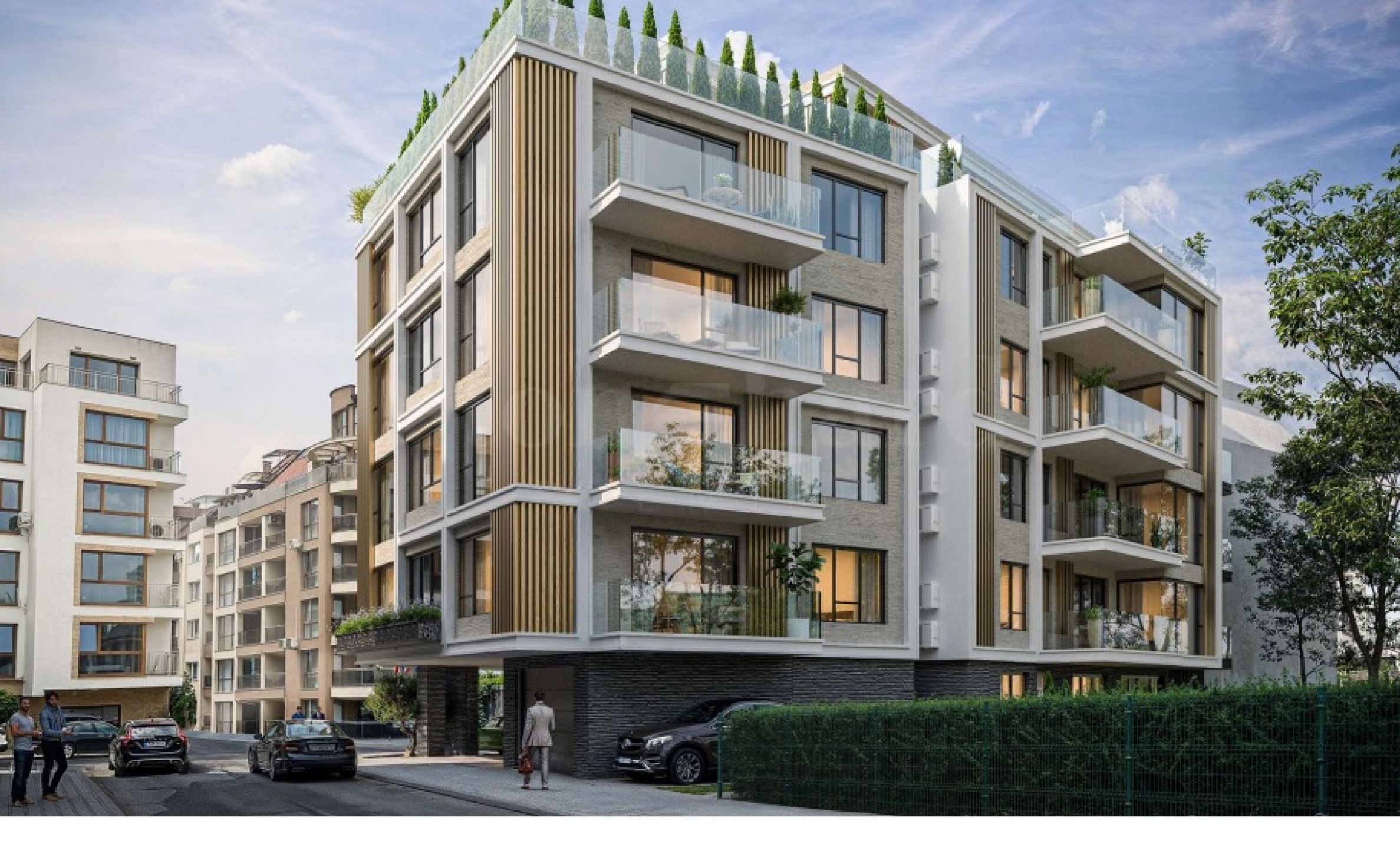 Станови ће бити завршени финим малтером на зидовима, кошуљицом на поду, висококвалитетним гранитним плочицама на балконима и панорамским прозорима са троструким стаклом у антрацит боји. Улазна врата су чврста блиндирана паметна врата, а заједнички простори ће бити луксузно завршени према дизајнерском пројекту. У згради ће бити уграђен лифт са 8 седишта из премиум серије Орона. Фасада ће бити вентилирана са каменом вуном од 10 цм, употпуњена декоративним висећим елементима.