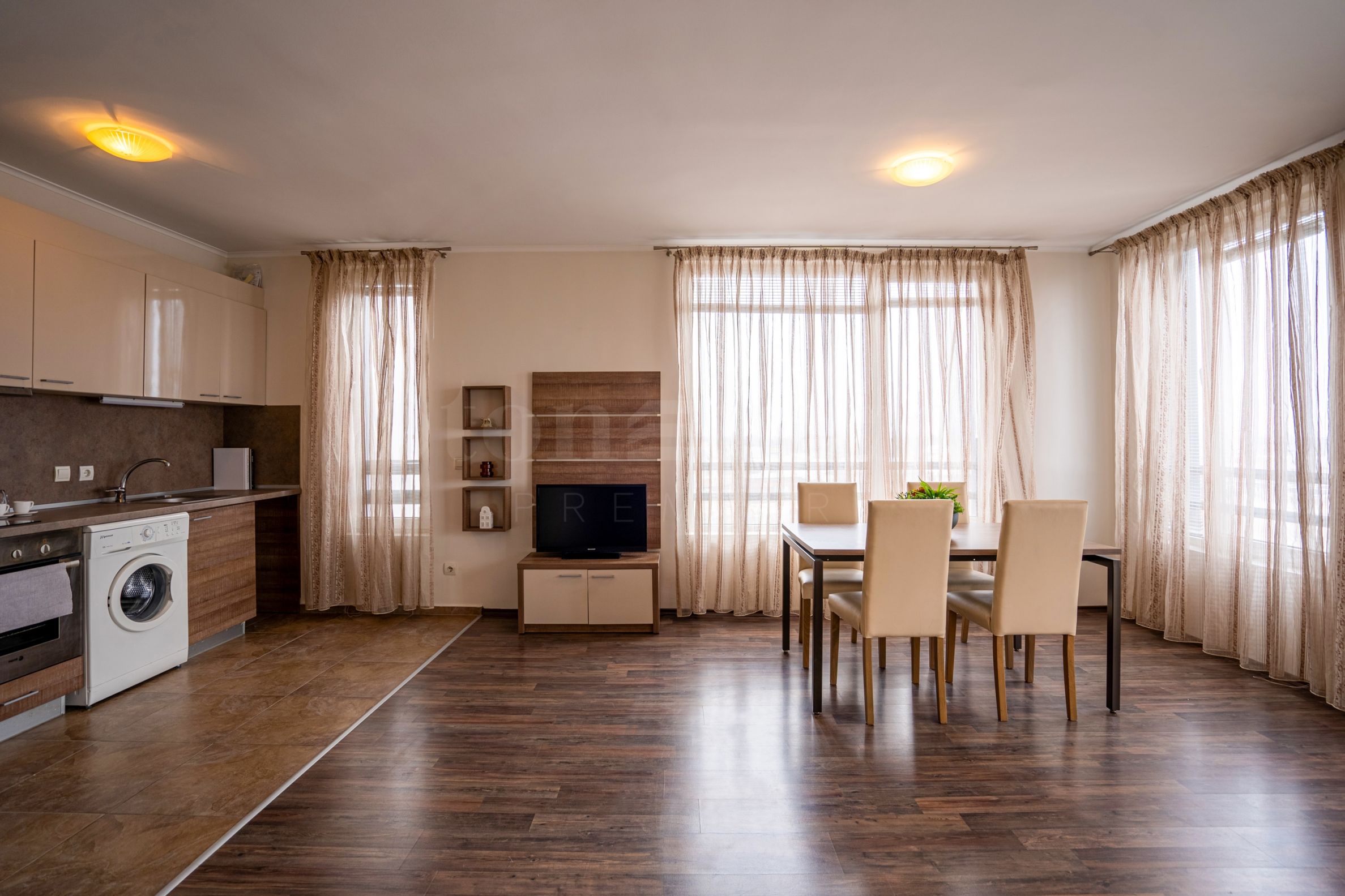 svetao dnevni boravak sa kuhinjskim blokom;